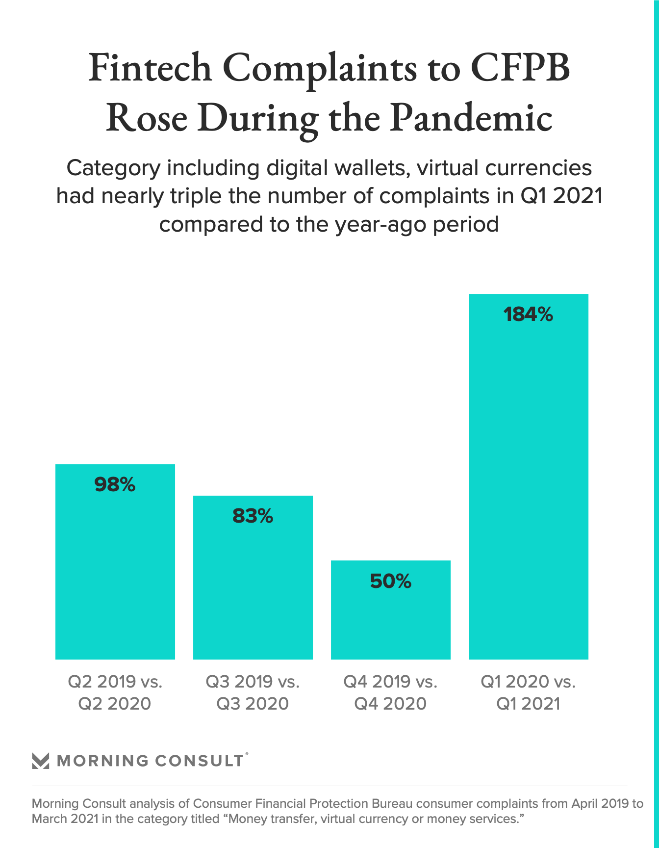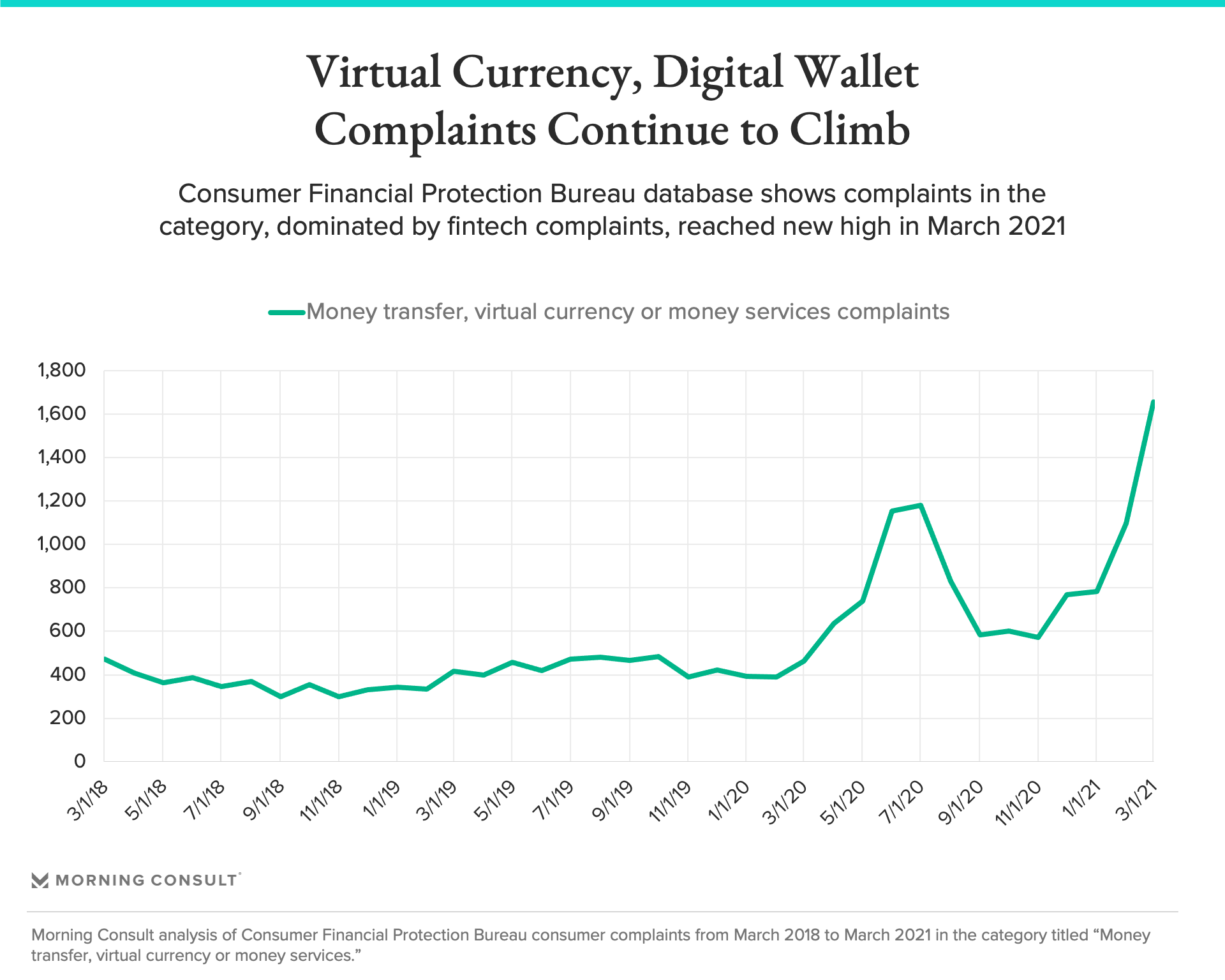 Complaints nearly tripled in the first three months of 2021 compared to the same period a year earlier, according to a new Morning Consult analysis of Consumer Financial Protection Bureau data. The analysis considered complaints filed to the agency in the category containing the bulk of fintech-related items, titled “money transfer, virtual currency or money services.”