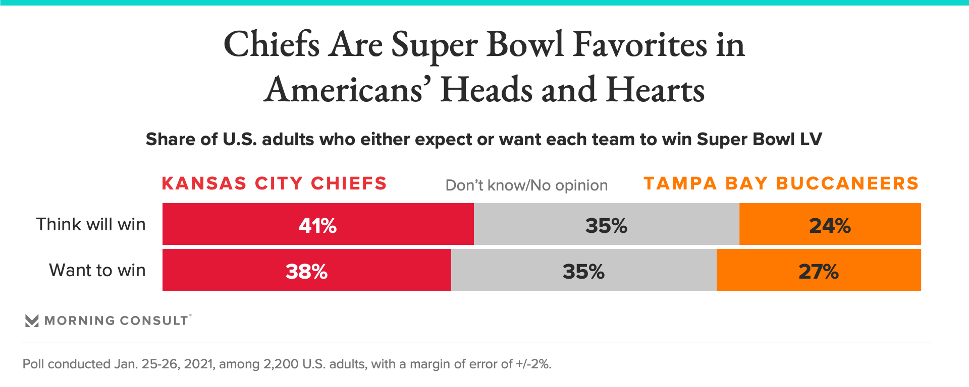 The results of a new Morning Consult poll indicate that 38 percent of U.S. adults will be cheering for the Chiefs when the teams meet Feb. 7 at Raymond James Stadium, including about half of those who expect to watch the game. By comparison, 27 percent of Americans and 35 percent of likely viewers will be behind the Buccaneers, who last took home the Vince Lombardi Trophy in 2003.