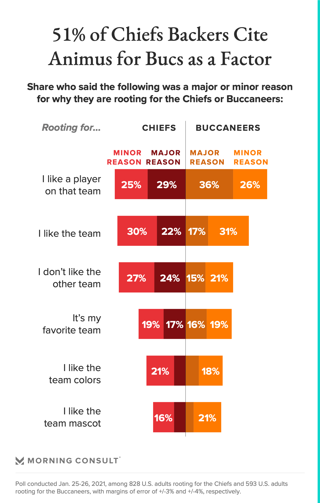 More than half of those rooting for the Buccaneers and those rooting for the Chiefs cited their admiration for a specific player as a reason for their choice, with 36 percent of those rooting for the Bucs saying it’s a “major” factor. While it’s safe to assume the bulk of those responses can be attributed to Brady, he is also likely to blame for the fact that about 1 in 4 Chiefs supporters said animus toward the opposition is a “major” factor behind their loyalty.