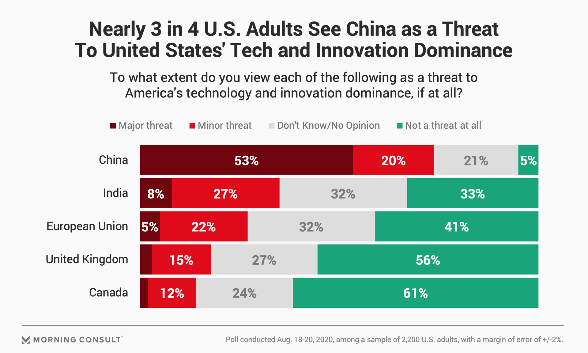 53% of U.S. adults see China as a “major threat” to America’s technology and innovation dominance.