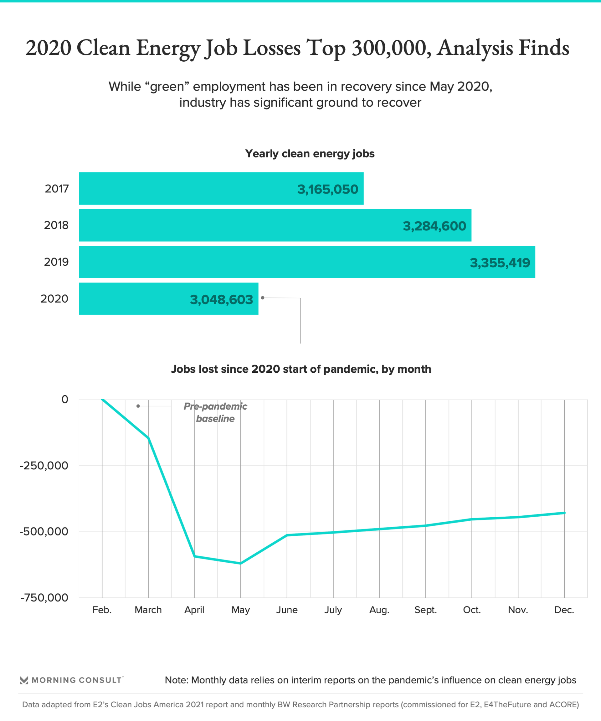 The U.S. clean energy industry lost nearly 307,000 jobs in 2020, with employment across the wind, solar, energy efficiency and other sectors dropping to roughly 3 million jobs by the end of the year, down from about 3.36 million in 2019, according to a new analysis from the environmental advocacy group Environmental Entrepreneurs (E2).