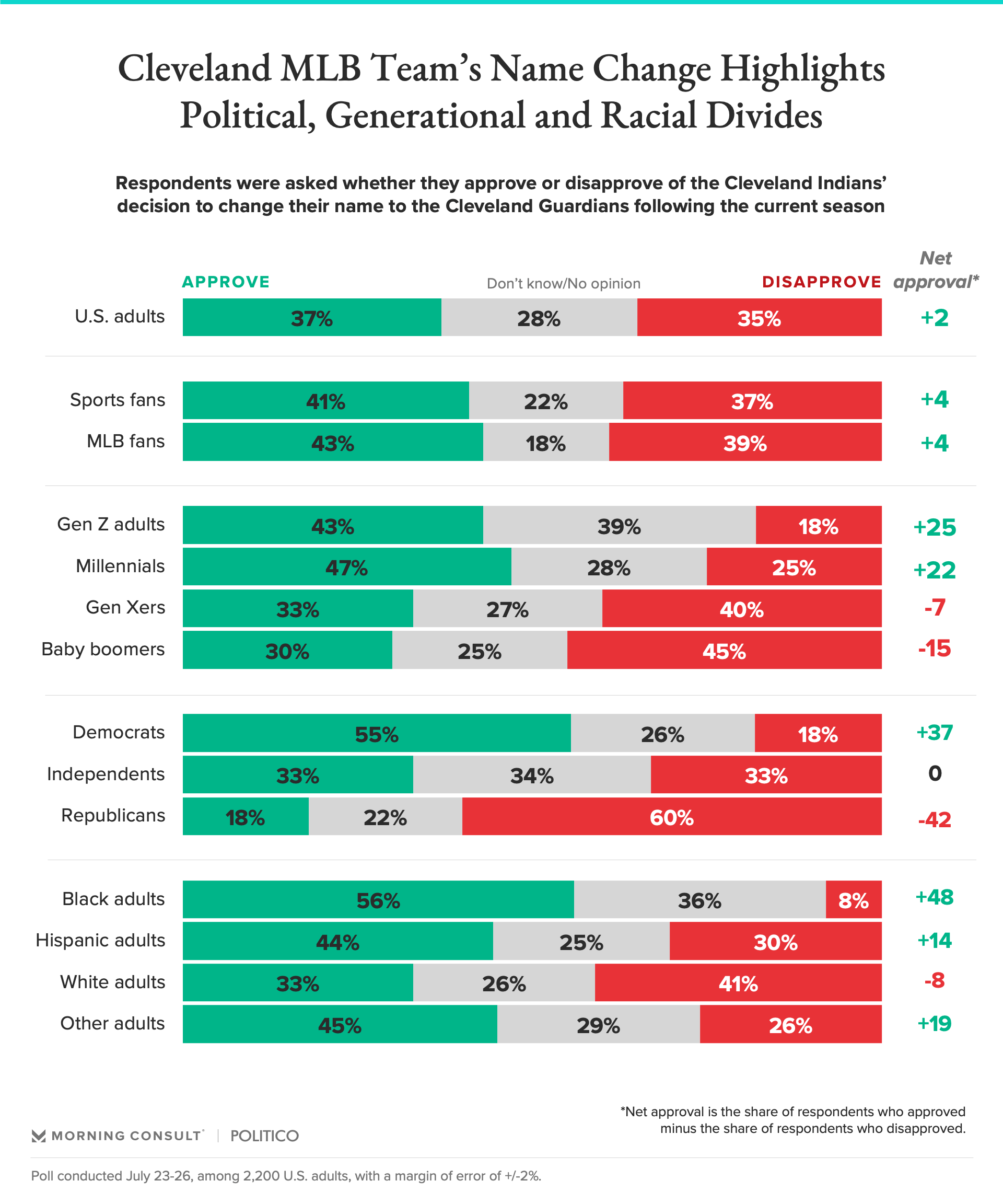 In a Morning Consult/Politico survey conducted following the announcement of the team’s new identity, 37 percent of U.S. adults said they approved of the switch from “Indians” to “Guardians,” while 35 percent of U.S. adults disapproved of the change. Forty-three percent of self-identified MLB fans supported the move, while 39 percent expressed opposition.