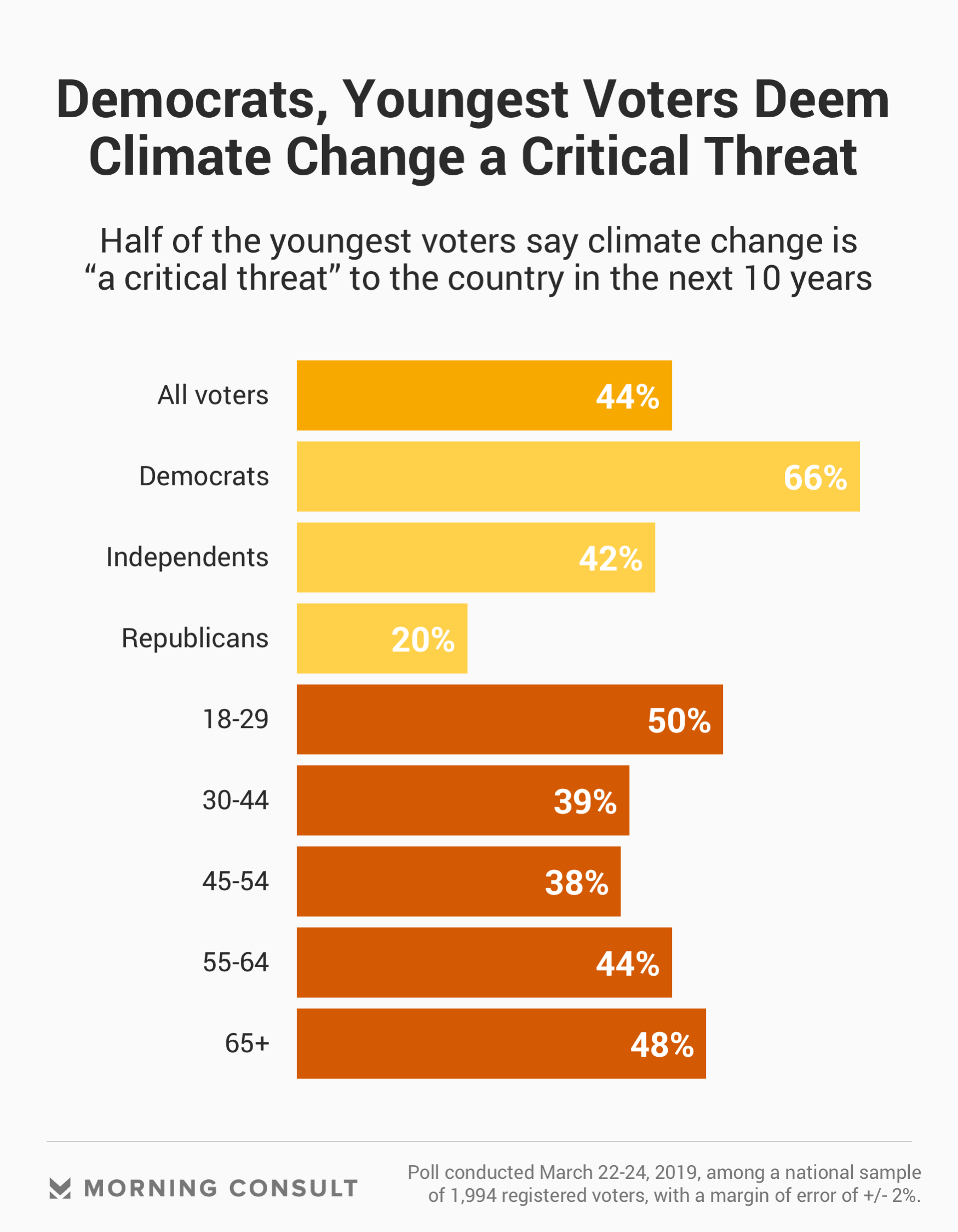 U.S. voters are registering concern about climate change: A March 22-24 Morning Consult poll of 1,994 registered voters found that 44 percent of voters consider climate change a critical threat to the vital interests of the United States in the next 10 years, while another 26 percent called it an important but not critical threat. Two-thirds of Democrats said climate change poses a critical threat, compared to one in five Republicans. The poll’s margin of error is 2 percentage points.