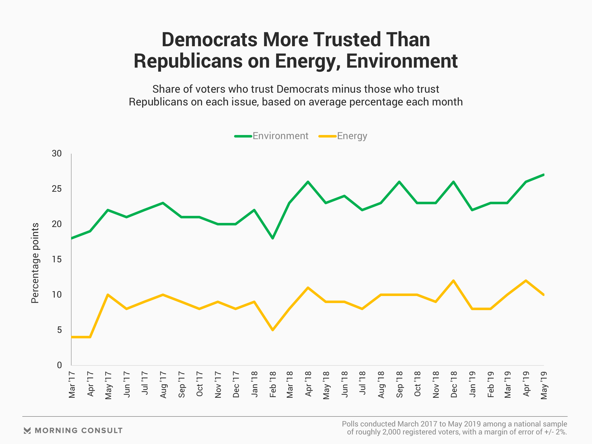 In the latest Morning Consult/Politico poll, a 45 percent plurality of voters said they trust congressional Democrats more than Republicans to handle energy matters, and 52 percent of voters place more trust in Democrats on environmental issues. The poll, conducted among 1,995 registered voters May 17-19, has a margin of error of 2 percentage points.