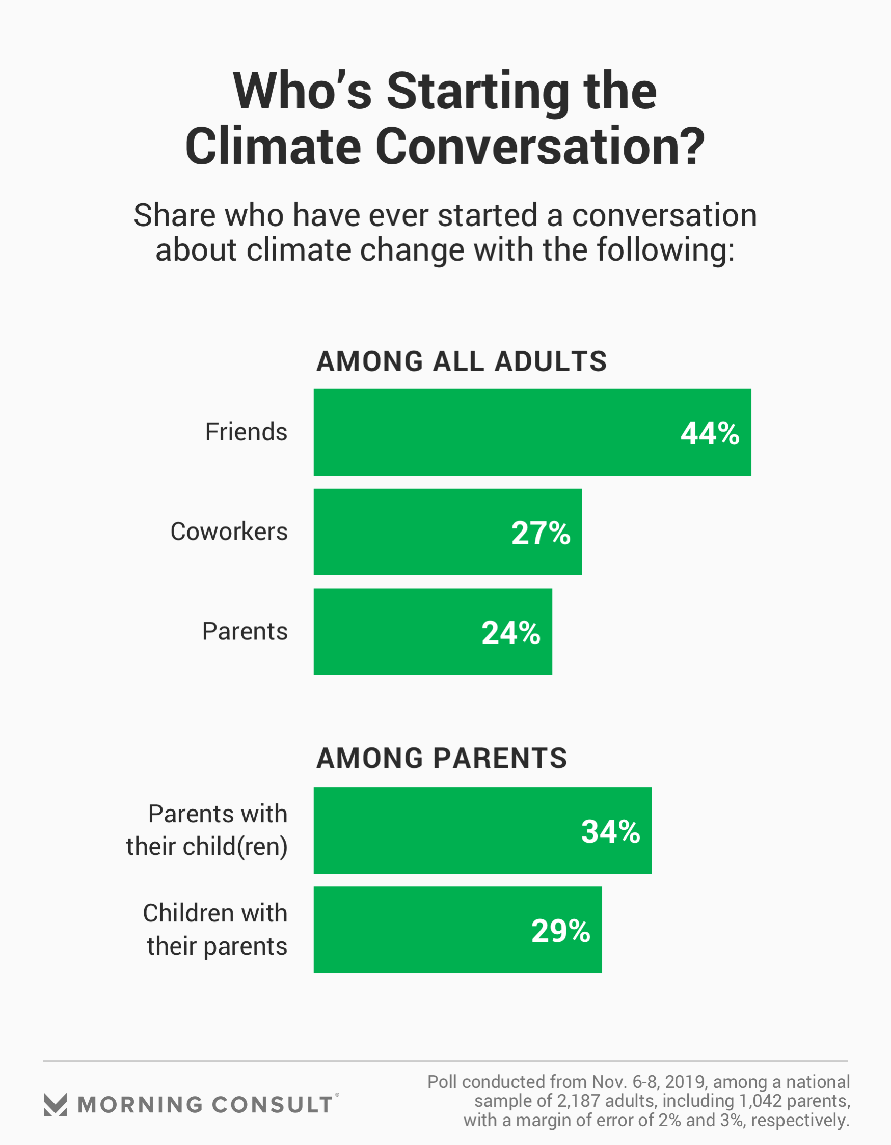 34% of parents said they have talked with their children about climate change; 29% said their children had raised the issue with them.