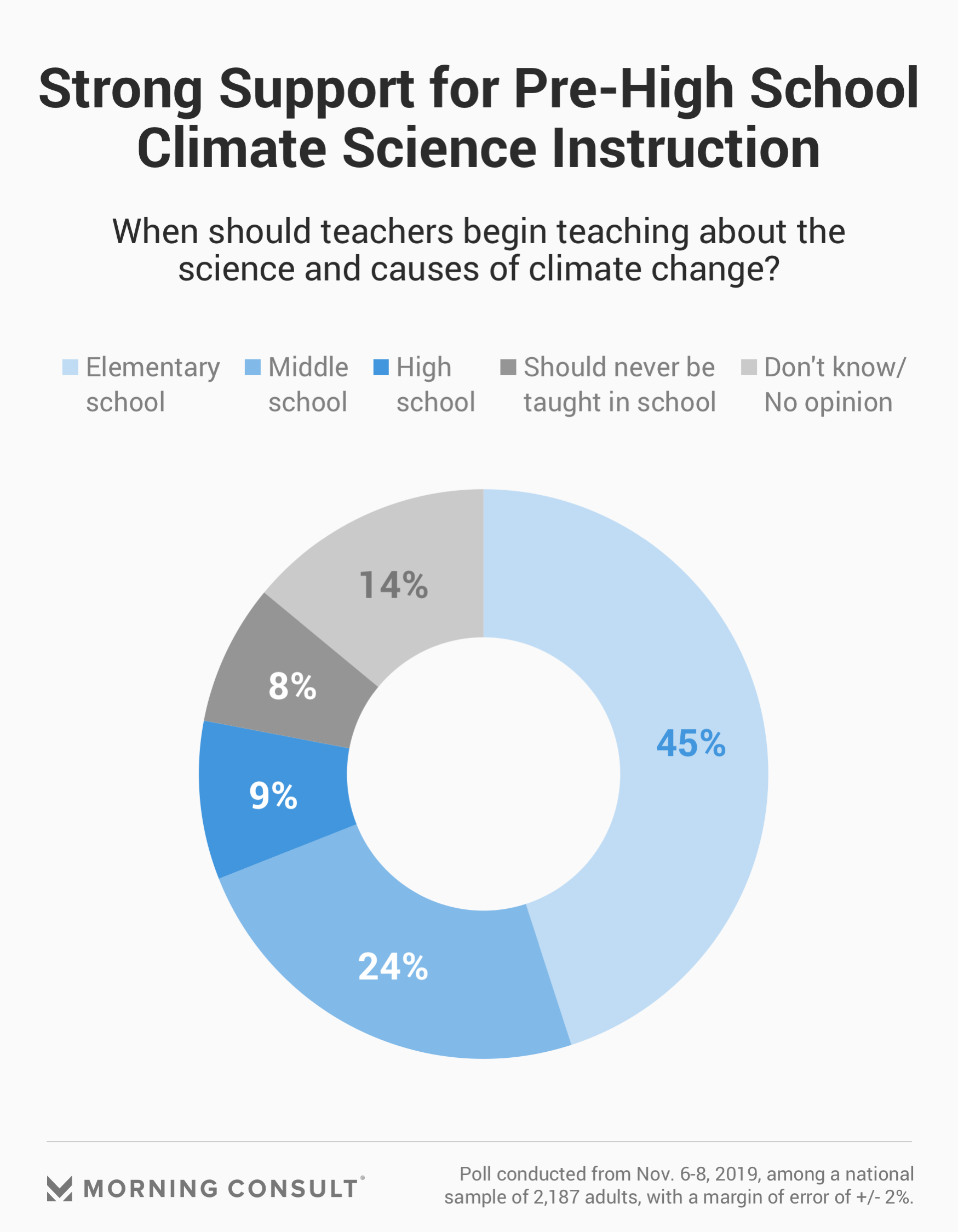 45% want climate science instruction to begin in elementary school. 8% said it should never be taught at school.