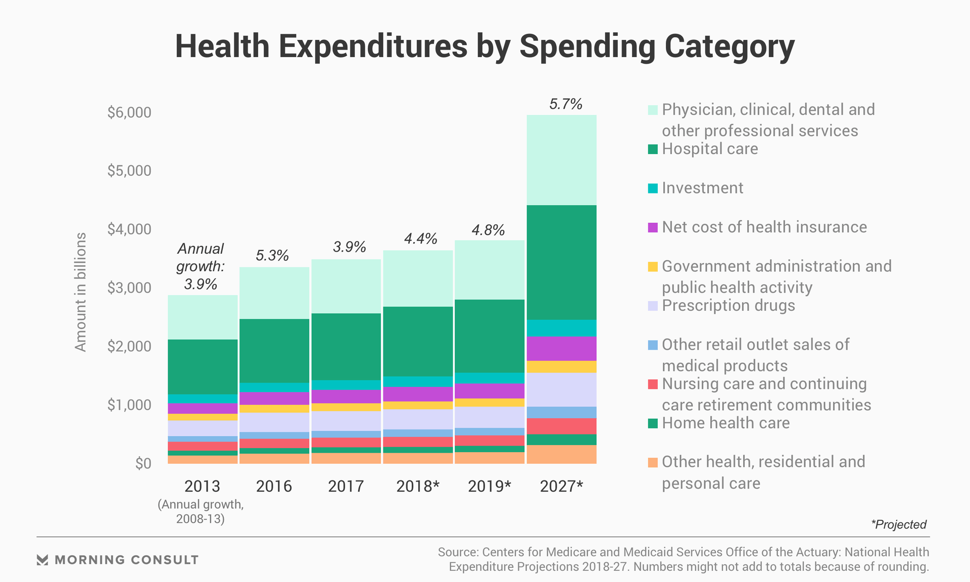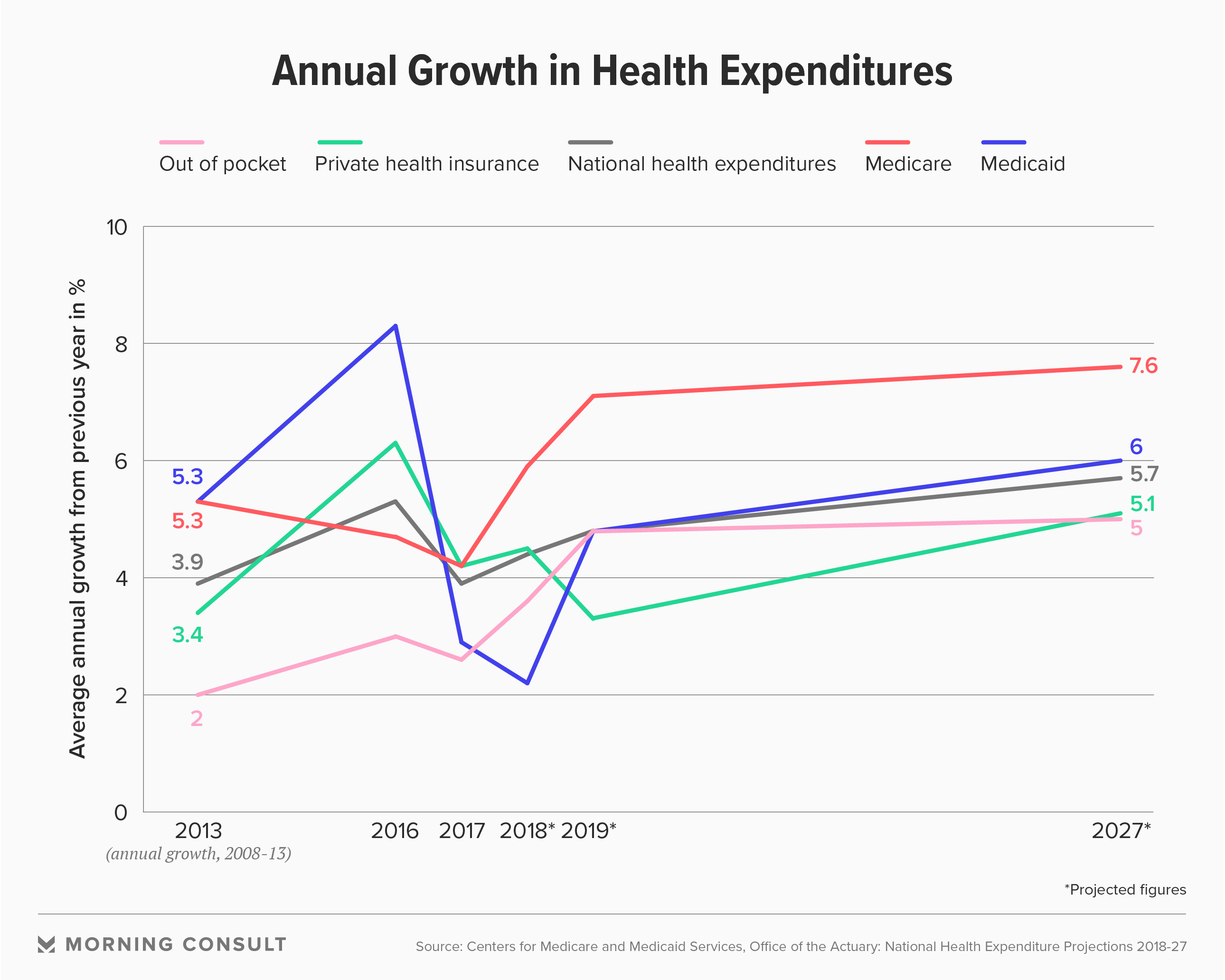 From 2018 to 2027, growth in health expenditures is expected to outpace annual GDP growth by 0.8 percentage points on average.