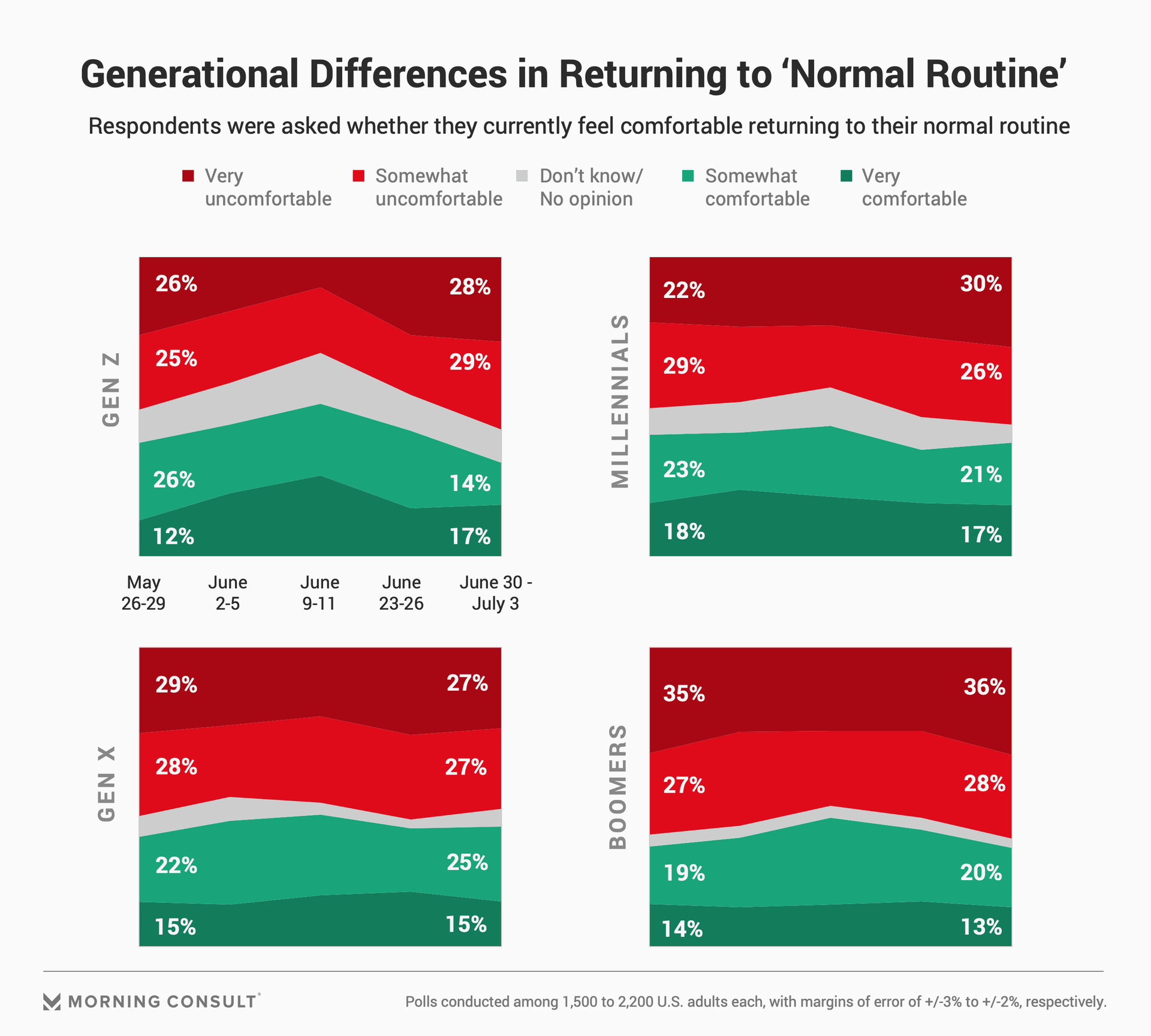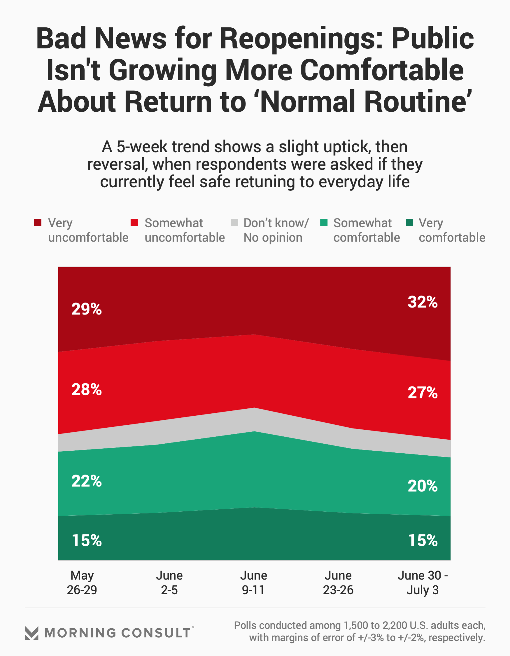 Just over one-third of the public said they feel comfortable returning to their “normal routine,” according to Morning Consult’s most recent polling on the question, conducted right before the July 4th weekend. That’s roughly equal to the share who said the same in late May.