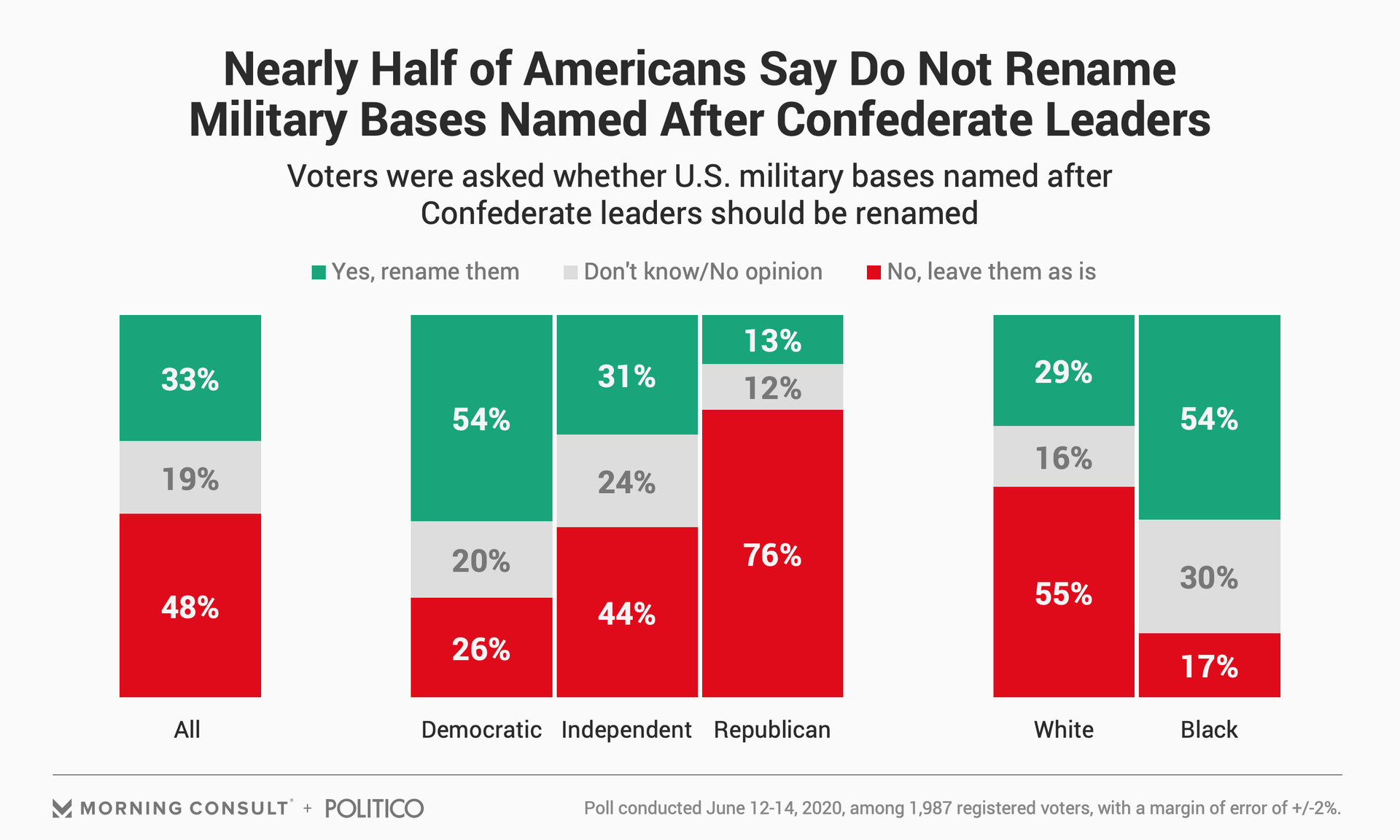 As President Donald Trump and some Senate Republicans work to kill an effort aimed at stripping the names of Confederate leaders from U.S. military bases, a new Morning Consult/Politico poll shows voters tend to agree with them.