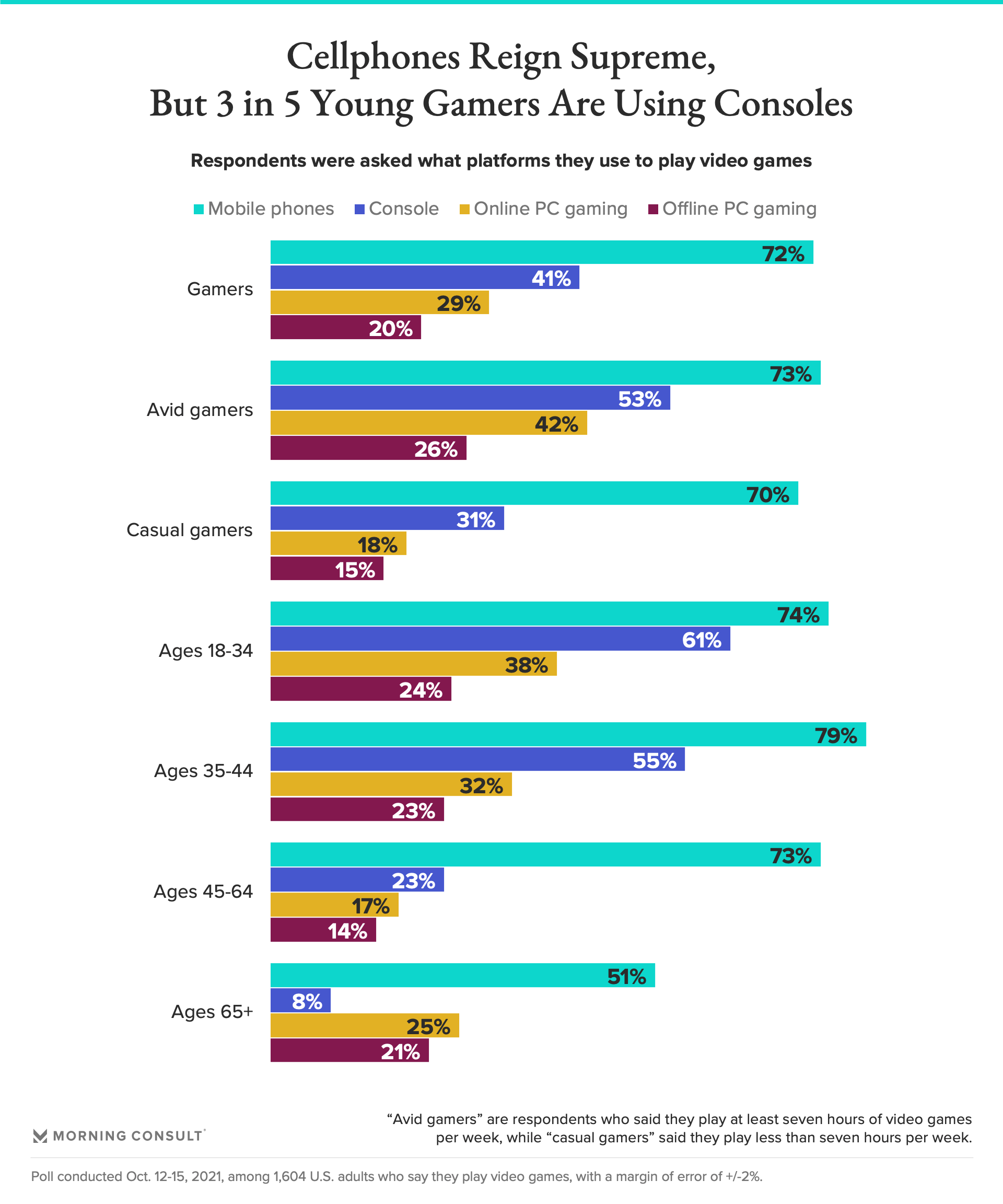 But even though new systems are scarce, Morning Consult polling shows that more than 3 in 5 gamers under 35 and just over half of avid gamers are using consoles — with many spending hundreds of dollars a year on their gaming habits.