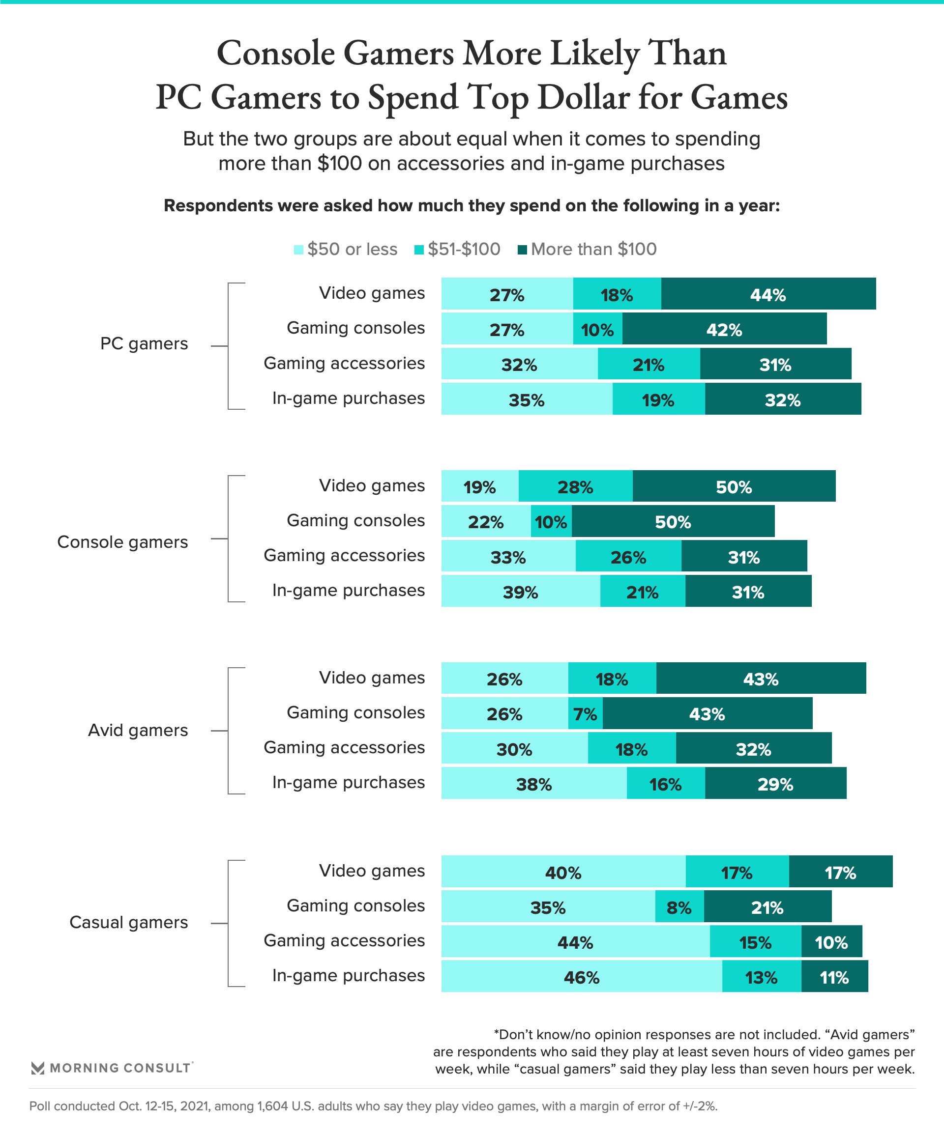- Half of console gamers are spending top dollar on games and consoles. Console gamers were more likely than PC gamers or avid gamers to say they spend more than $100 a year on video games and consoles, but nearly a third of both PC gamers and console gamers said they’re spending an equal amount to purchase accessories or in-game add-ons.