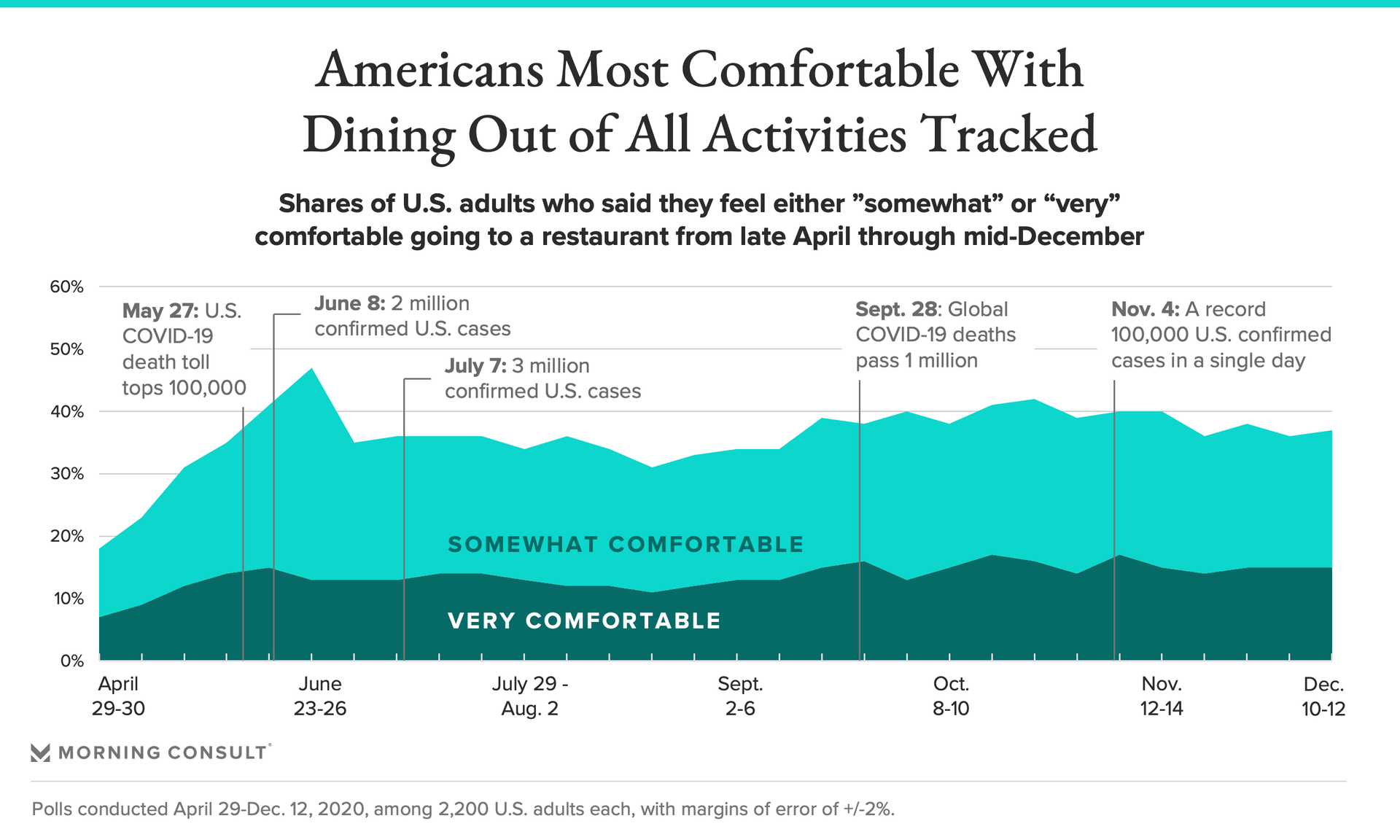 Morning Consult has been checking in with consumers every week since April, gauging their comfort levels with a variety of leisure activities. To round out 2020, we’re taking a closer look at how the public's safety levels shifted over the year, and what 2021 might bring.
