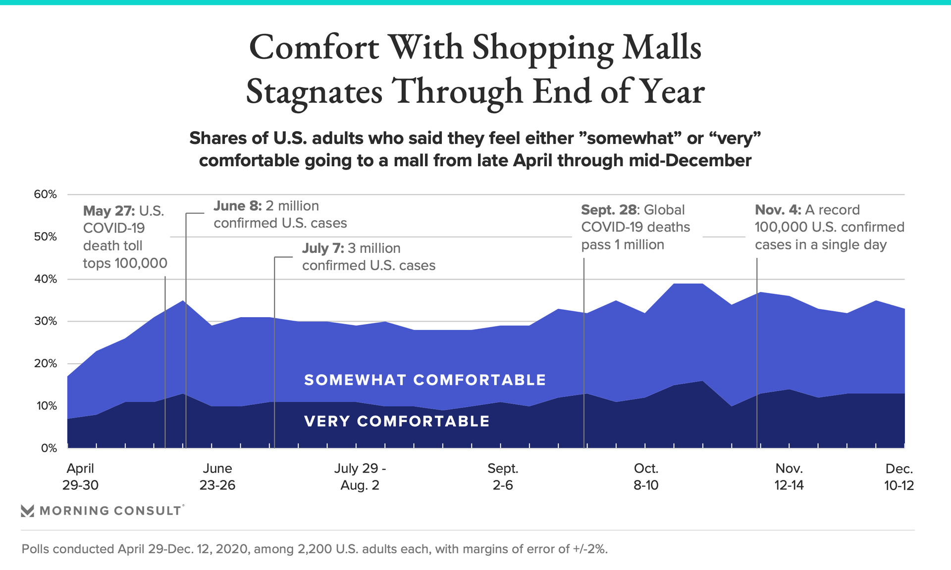 Consumers have been relatively comfortable with visiting shopping malls through the pandemic, at least compared to going to movie theaters or gyms. As of mid-December, one-third of U.S. adults said they felt safe at a mall.