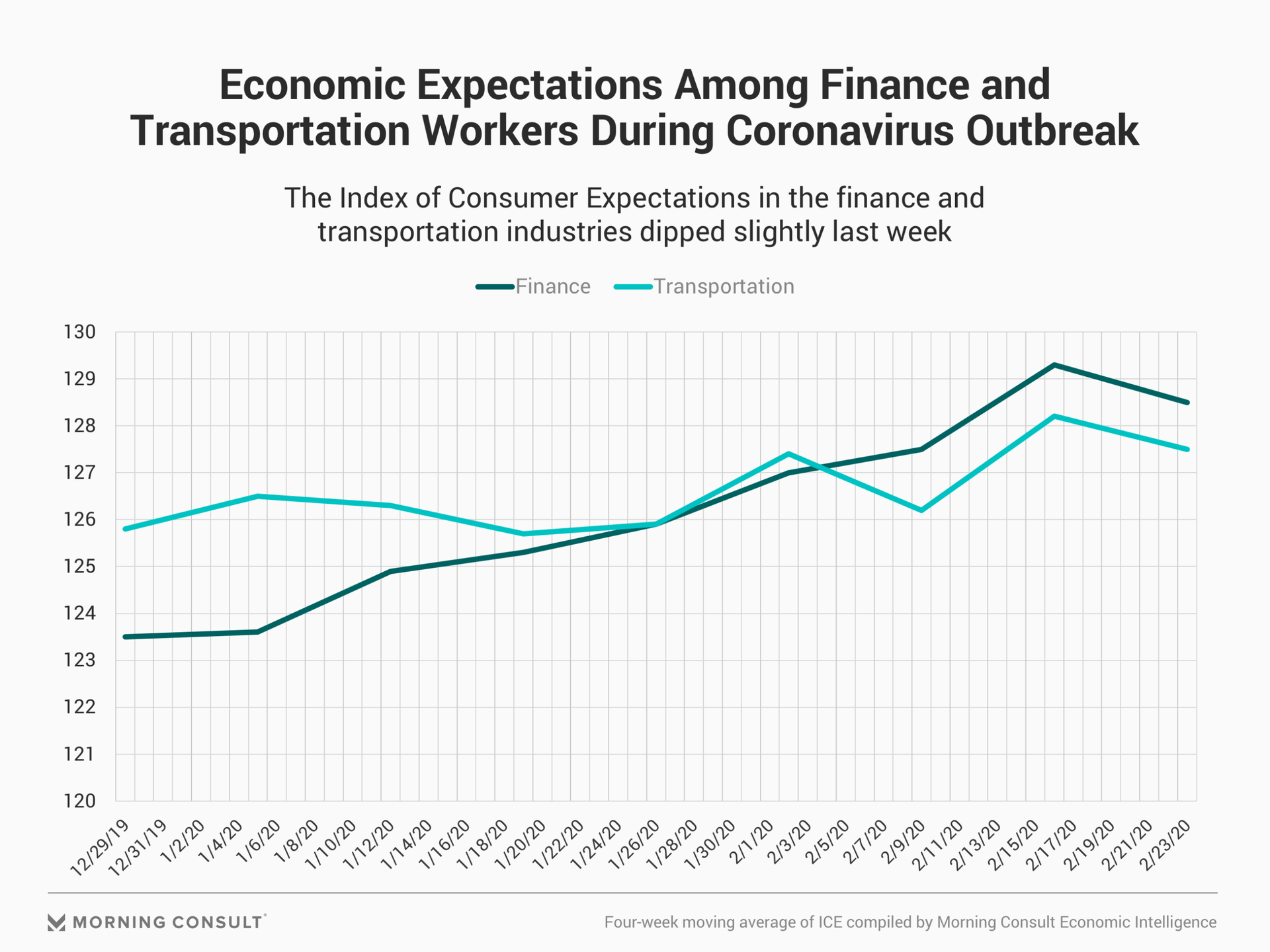 Because the latest Morning Consult data covers the week ending Feb. 23, it doesn’t reflect any changes in consumer sentiment that might have resulted from the sharp drops in U.S. financial markets Monday and Tuesday or take into account the Centers for Disease Control and Prevention’s announcement that it expects coronavirus to spread in the United States.