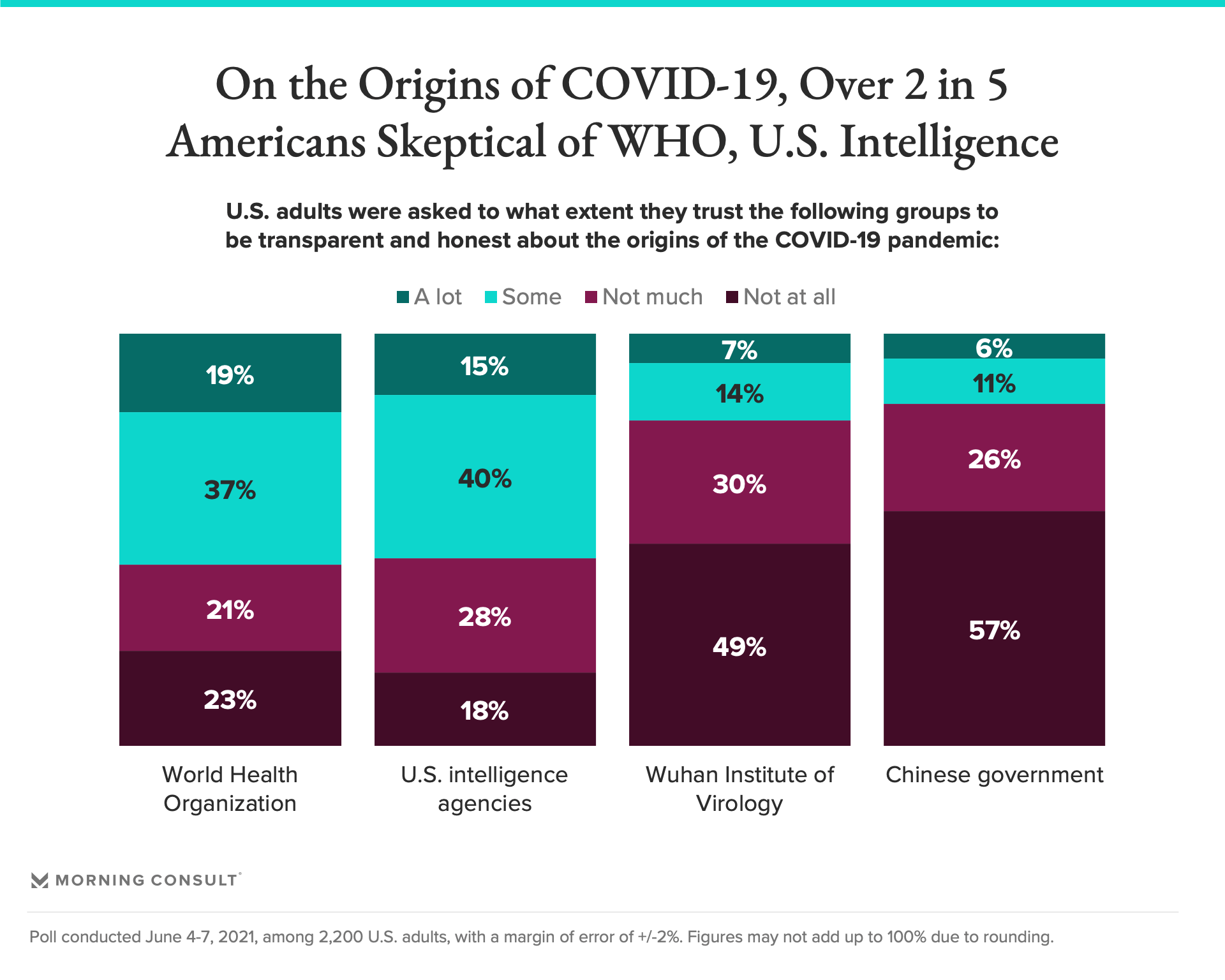 Much of the public is wary of the institutions probing the coronavirus. Just over half of adults trust U.S. intelligence agencies or the World Health Organization “a lot” or “some” to be transparent and honest about how the pandemic started, while roughly 1 in 5 said the same for the Wuhan Institute of Virology and the Chinese government.