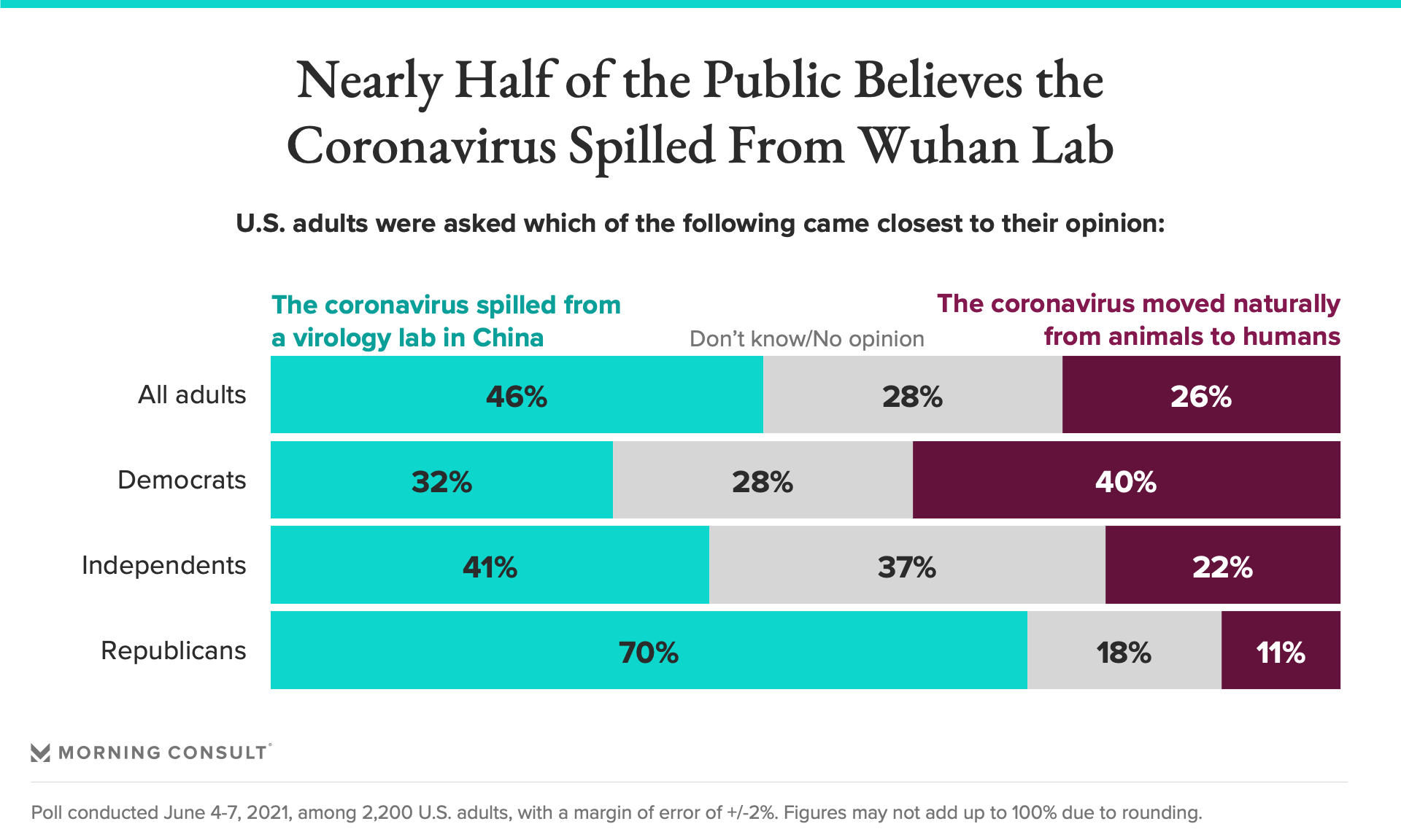 - 70% of Republicans and 32% of Democrats believe the coronavirus spilled from a lab in Wuhan, China.
