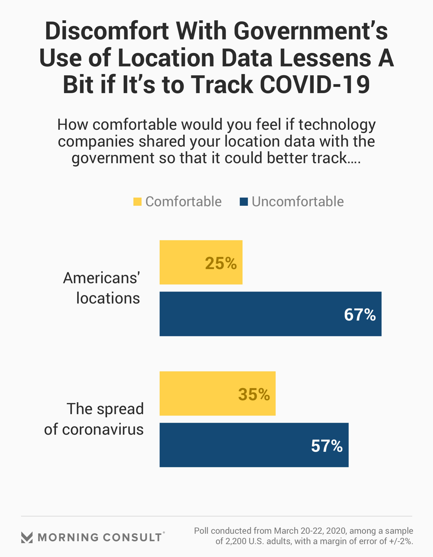 According to the survey, conducted March 20-22, 67 percent of U.S. adults said they would be uncomfortable with the idea of the U.S. government having access to their geolocation data, but that figure drops to 57 percent if that data is used to better track the spread of the coronavirus.
