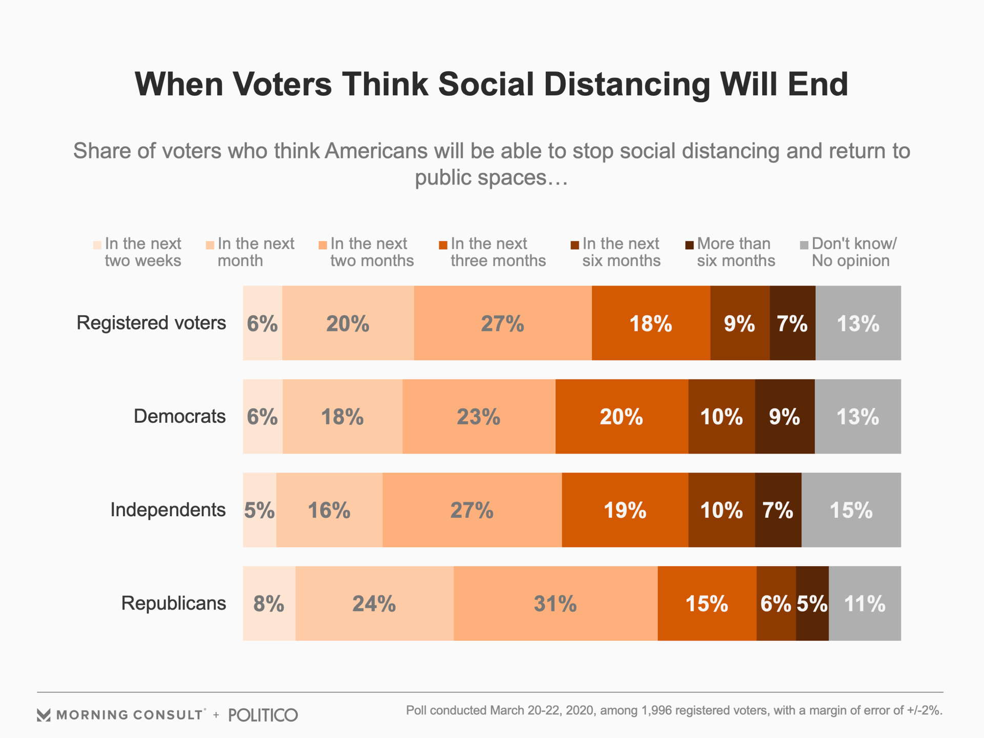 1 in 5 voters think public activity will resume in the next month; 27% say two months.