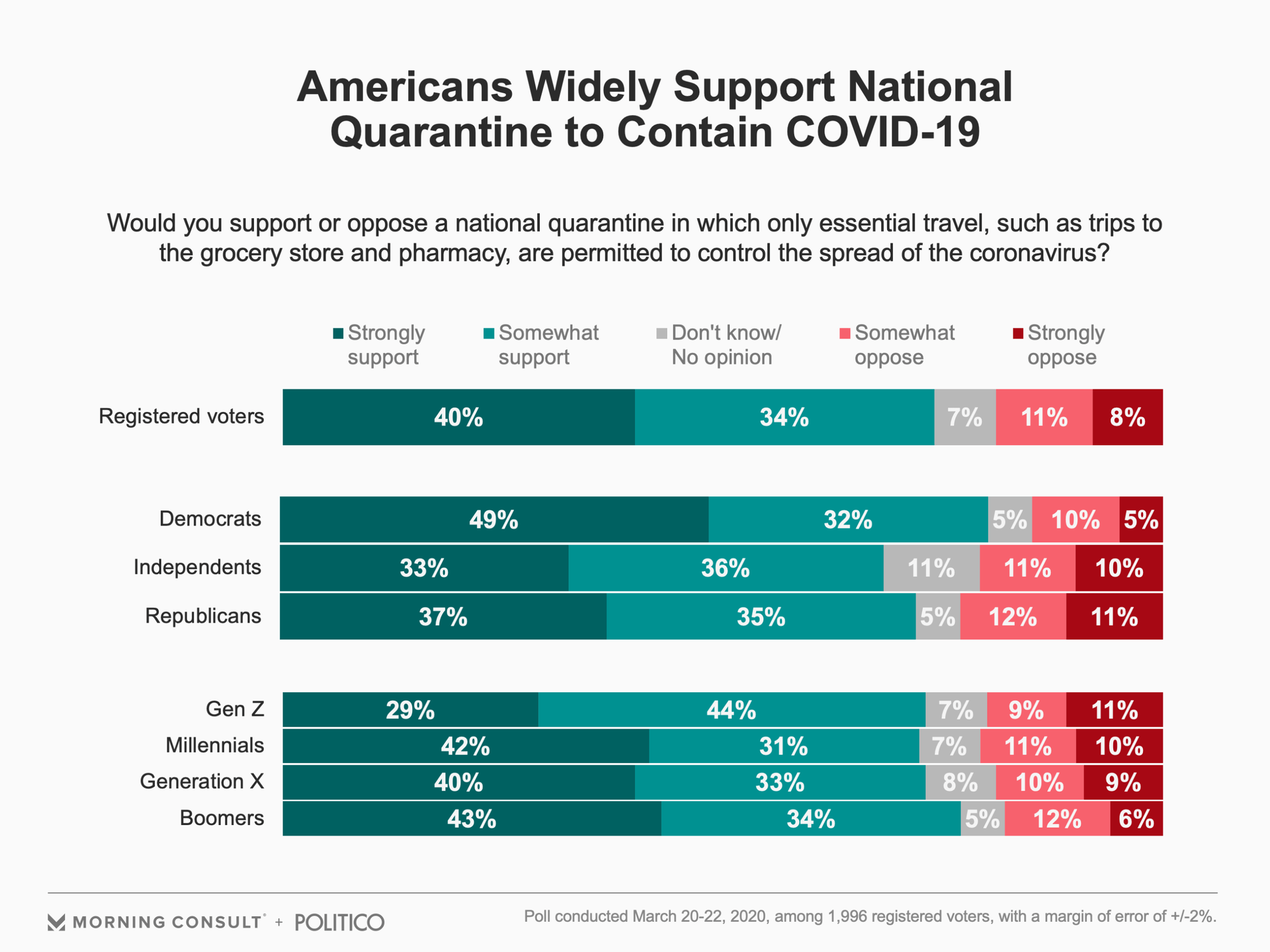 74% of voters support a national quarantine, limiting activity except essential trips such as to the grocery store and the pharmacy.