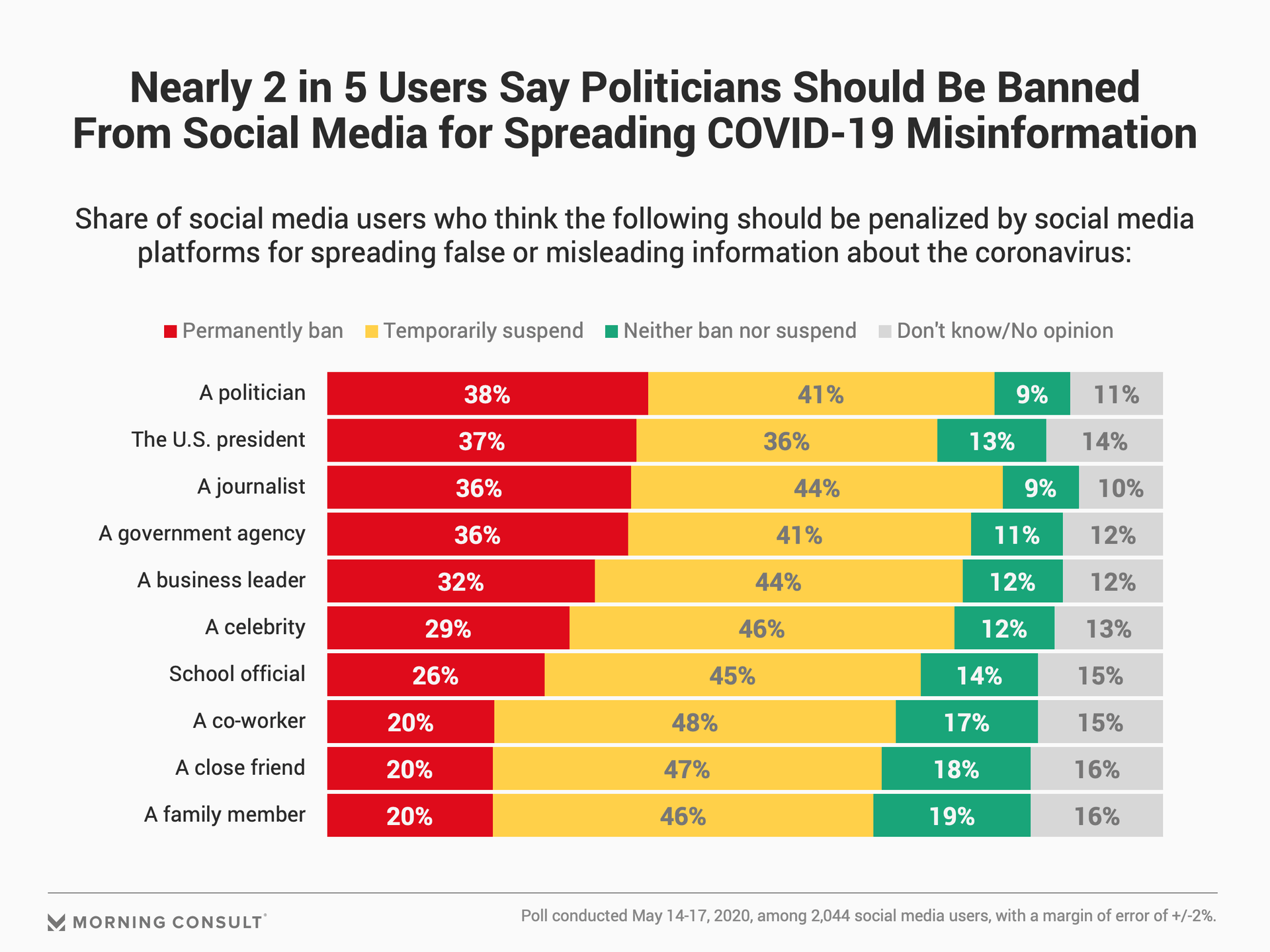 38% of social media users said politicians should be banned from platforms for spreading false or misleading coronavirus misinformation -- the highest of any public figure surveyed.