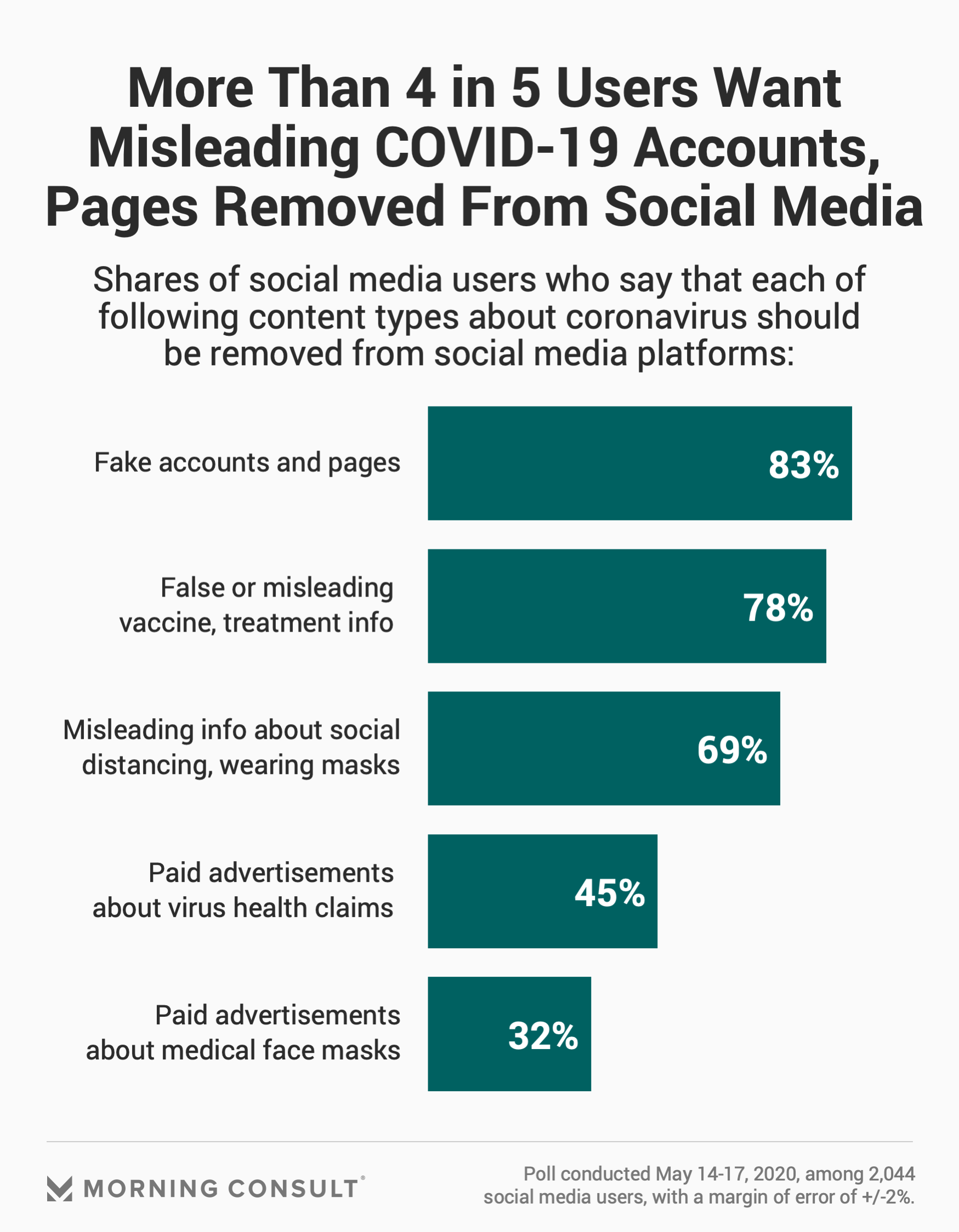 32% of social media users want false or misleading coronavirus content removed from all social media sites, not just the platform where it was originally posted.