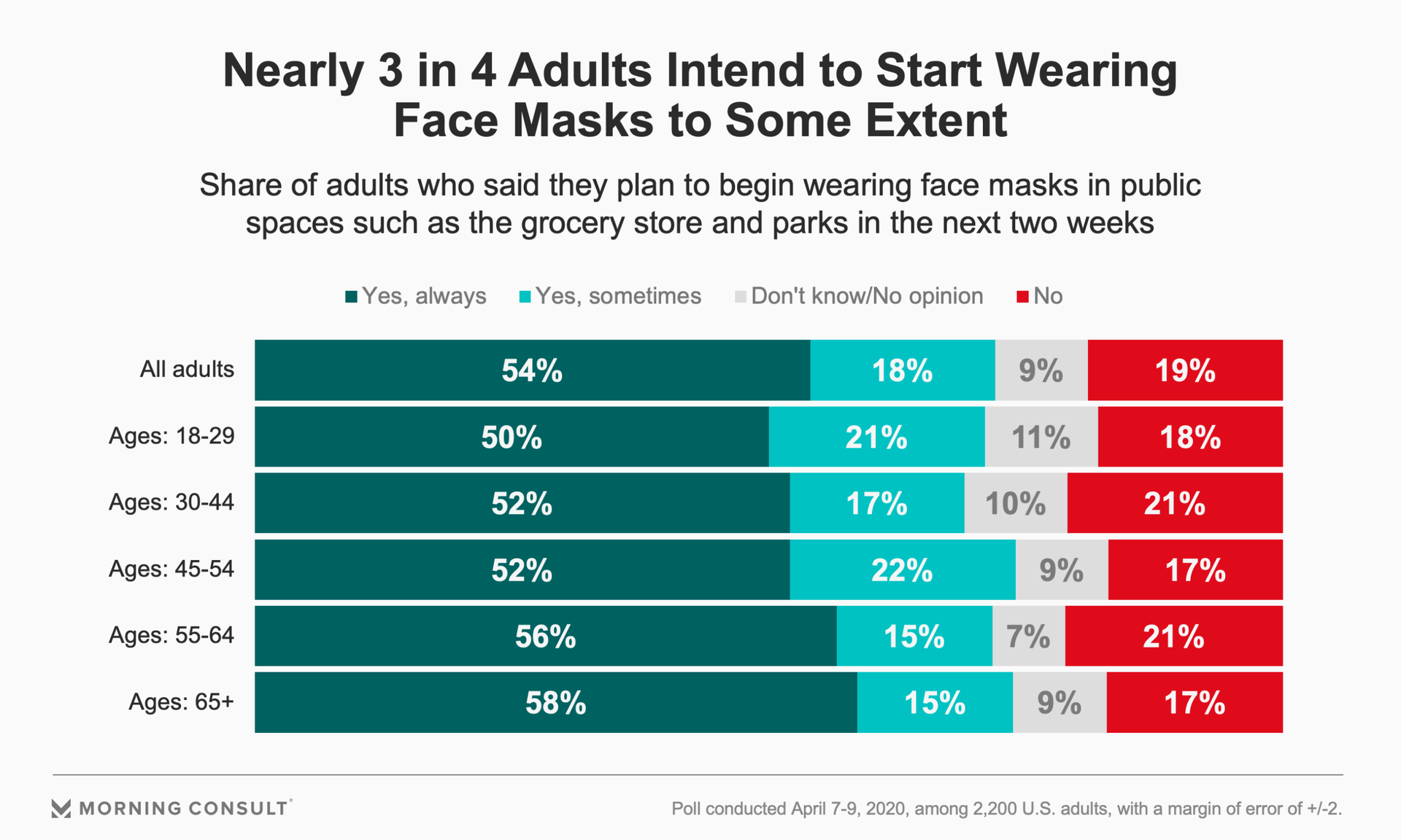 - 54% of adults plan to always wear a mask in public in the next two weeks, and 18% plan to do so sometimes.