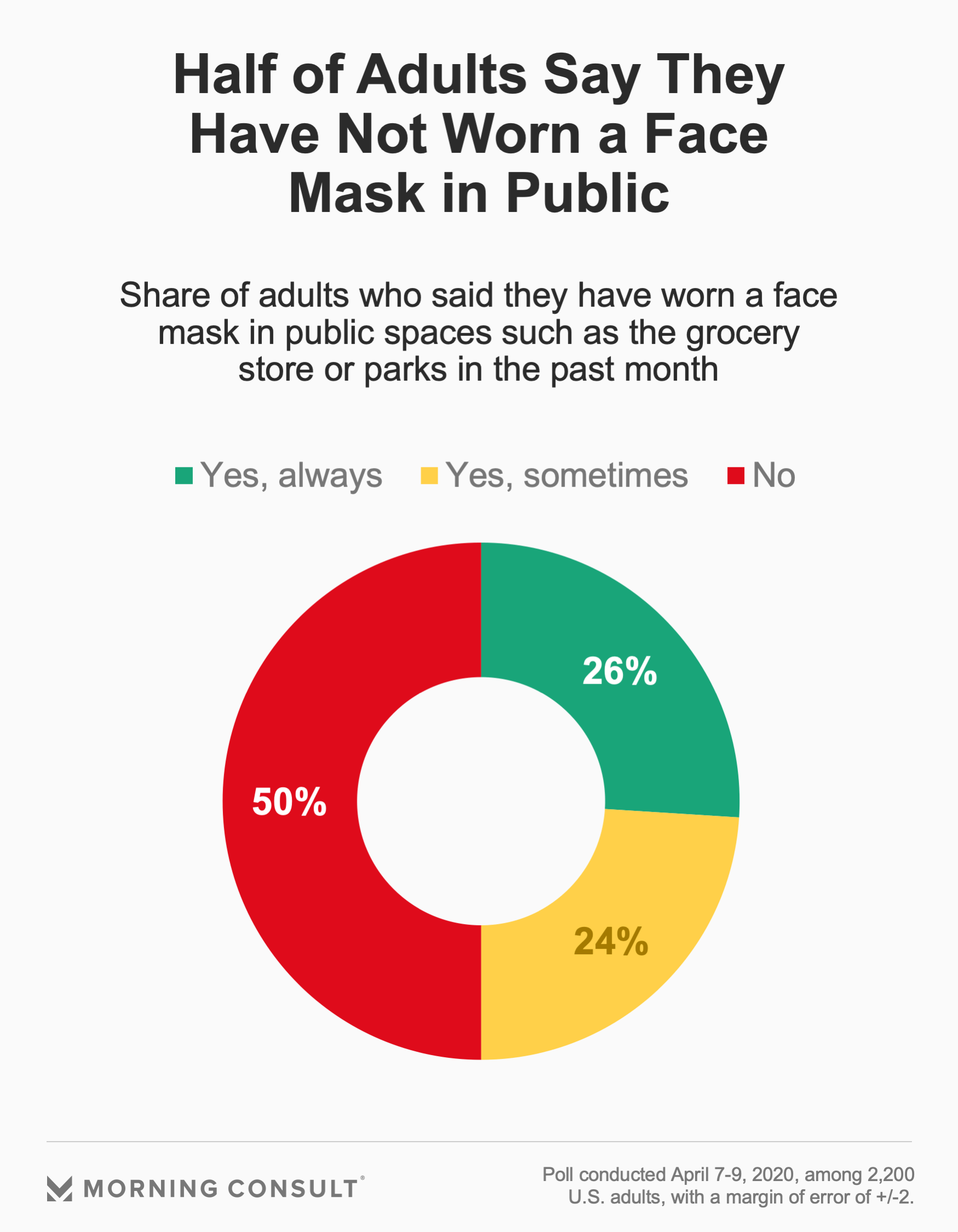 The Morning Consult survey, conducted April 7-9 among 2,200 U.S. adults, found that 50 percent said they have worn face masks in public spaces such as grocery stores and parks to some extent in the past month, with 26 percent saying they always wear a mask and 24 percent saying they do so sometimes. The other half of adults said they have not worn a face mask at all when out in public.