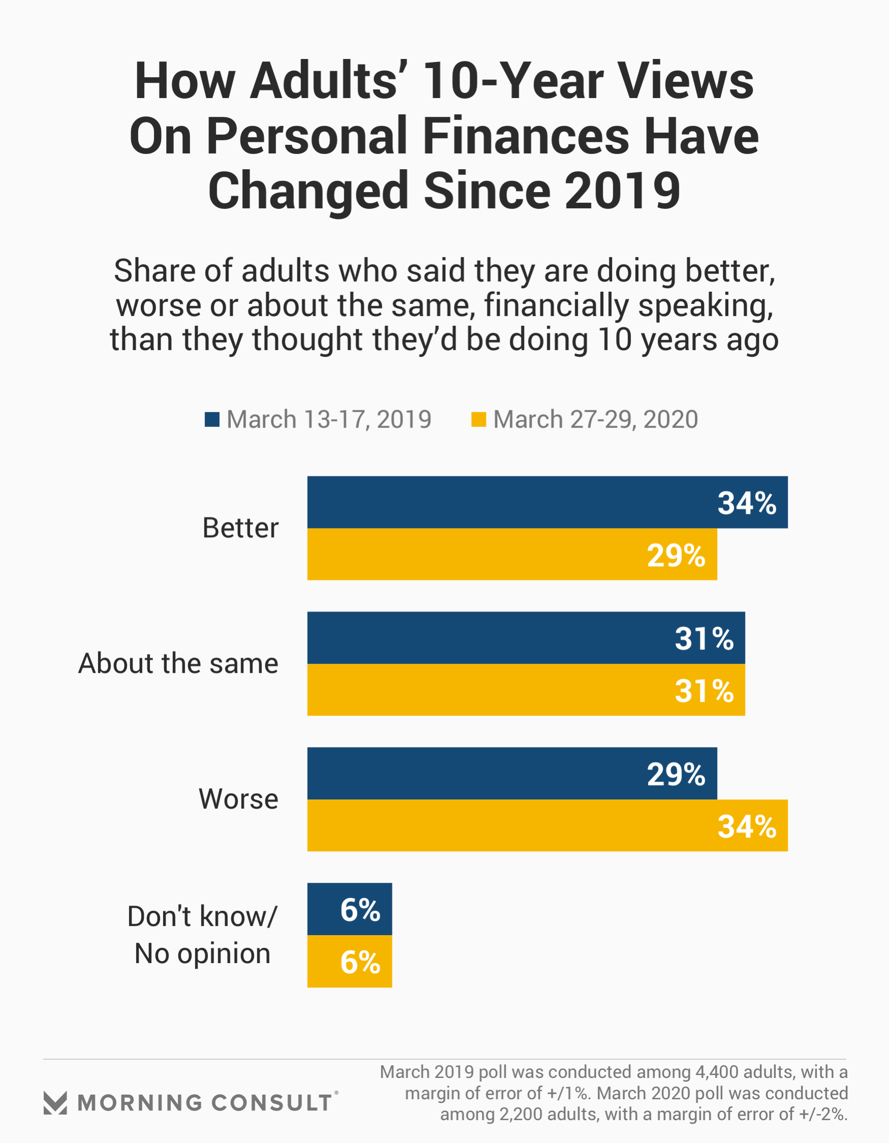 Meanwhile, the share of adults who said they are doing better, financially speaking, than they thought they’d be doing 10 years ago has fallen 5 points, to 29 percent, from a survey of 4,400 adults conducted March 13-17, 2019. Along with that decline has been a 5-point jump in the share of adults who said they’re doing worse than they expected a decade ago, from 29 percent in March 2019 to 34 percent now.
