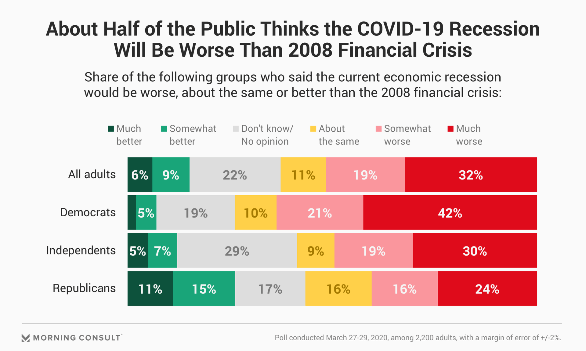 Democrats (63%) are more likely than Republicans (40%) to think the coronavirus-induced recession will be worse than 2008.
