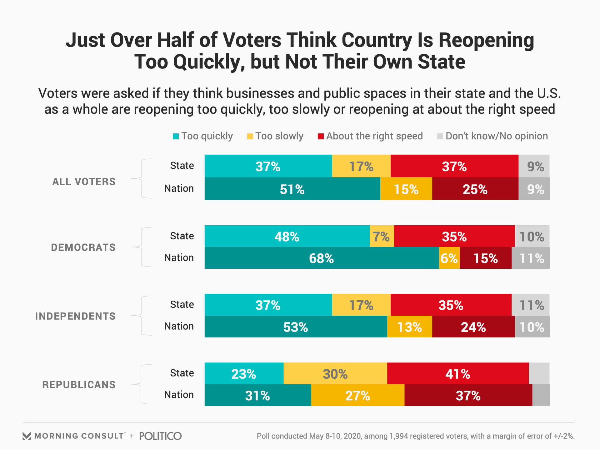New Morning Consult/Politico data shows that just over half of voters think the United States as a whole is moving too fast to reopen amid the pandemic, while views on their own state’s response are more divided.