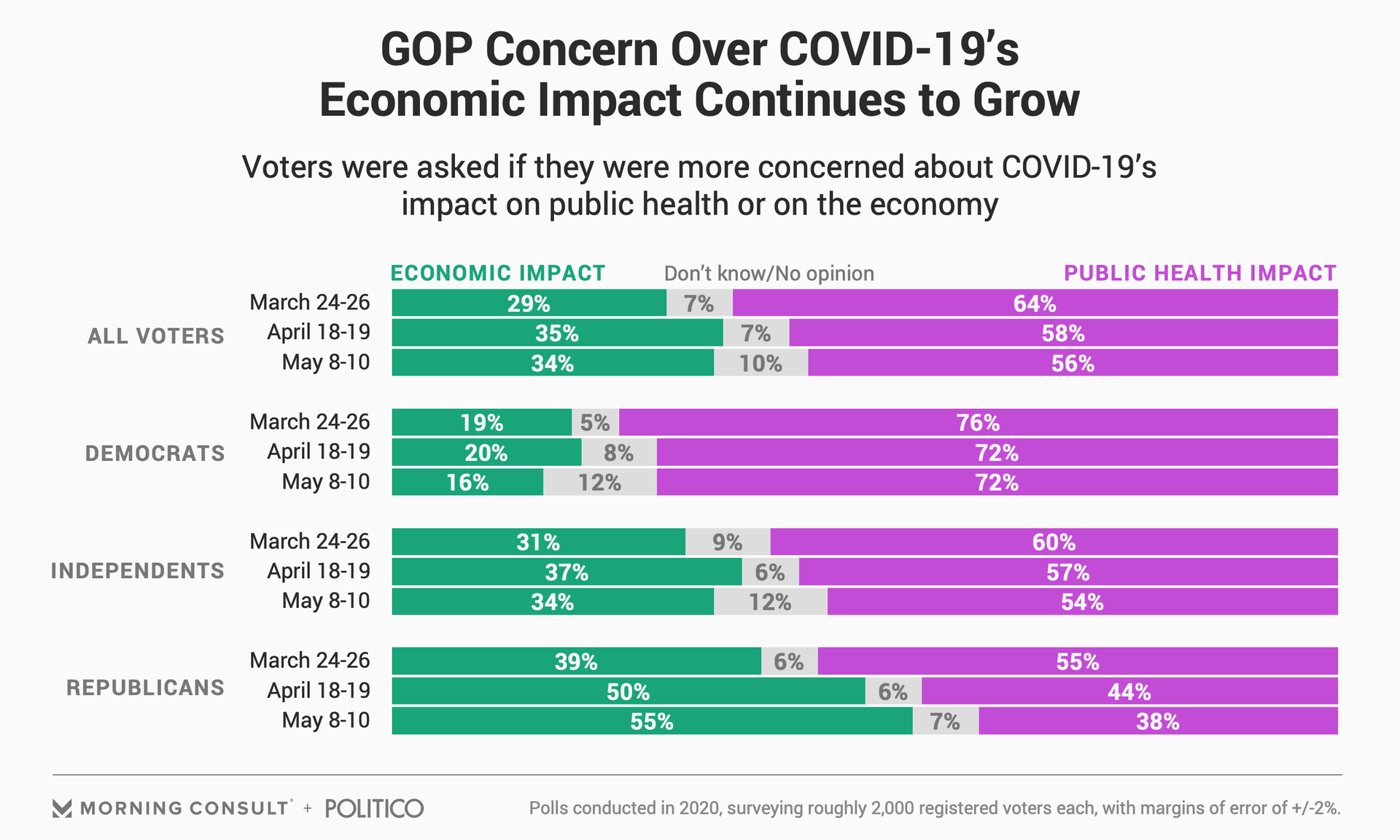 - For the first time, a slim majority of GOP voters say they are more concerned about pandemic’s economic impact than public health impact.