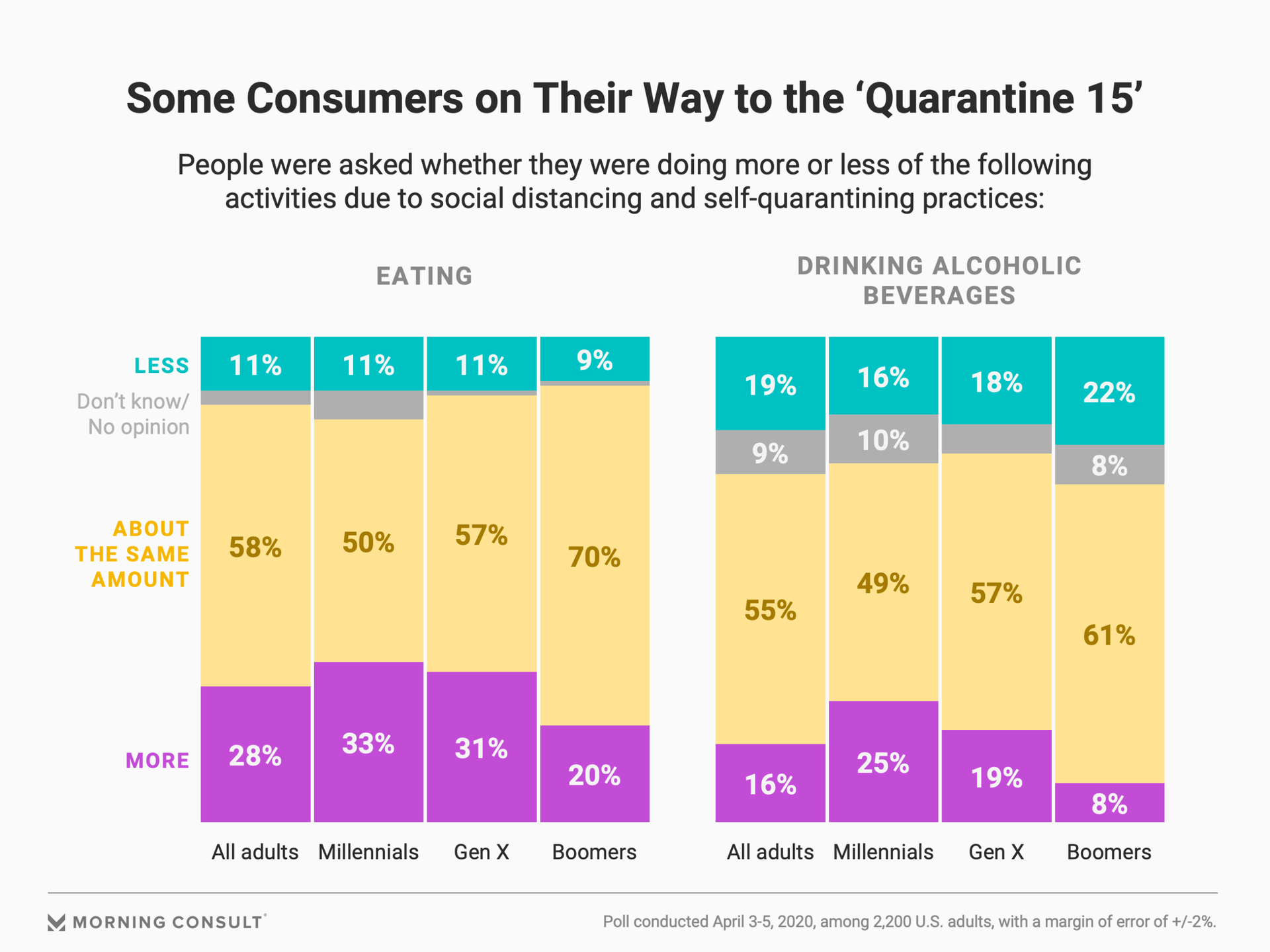Trapped at home with cabin fever amid the coronavirus pandemic — it's an emotional time for everyone. Millennials are leading the way in two types of common coping mechanisms, according to new Morning Consult polling: eating and drinking alcohol.
