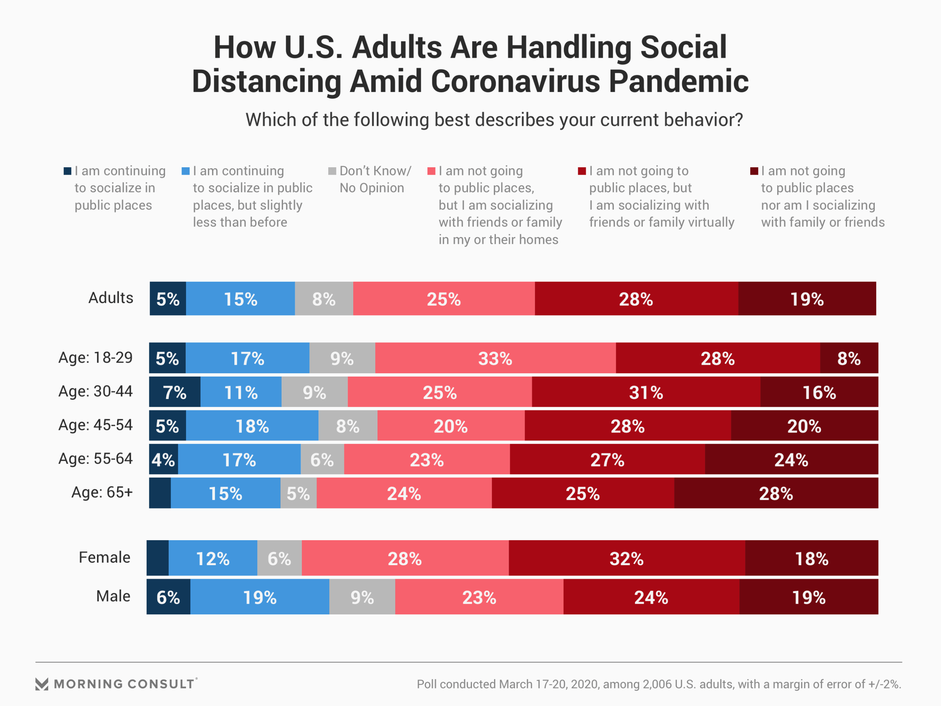 At 28%, adults 65 and older are the most likely age group to practice total social isolation, and adults 18-29 are least likely at 8%.