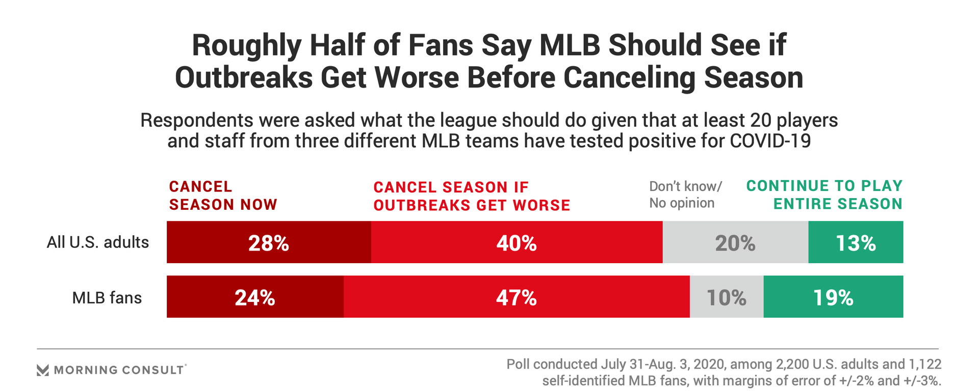 24% of MLB fans believe the league should cancel its current season amid current outbreaks.