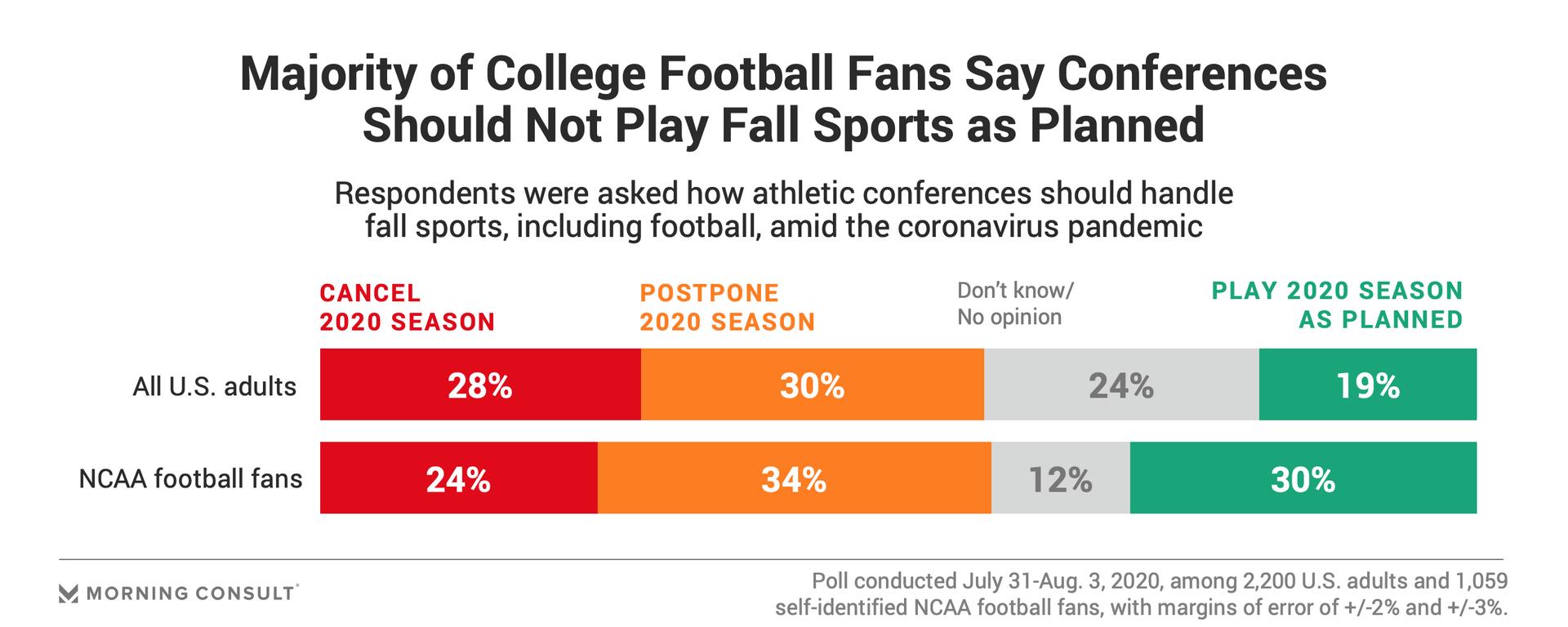 58% of college football fans believe conferences should either postpone or cancel fall sports.