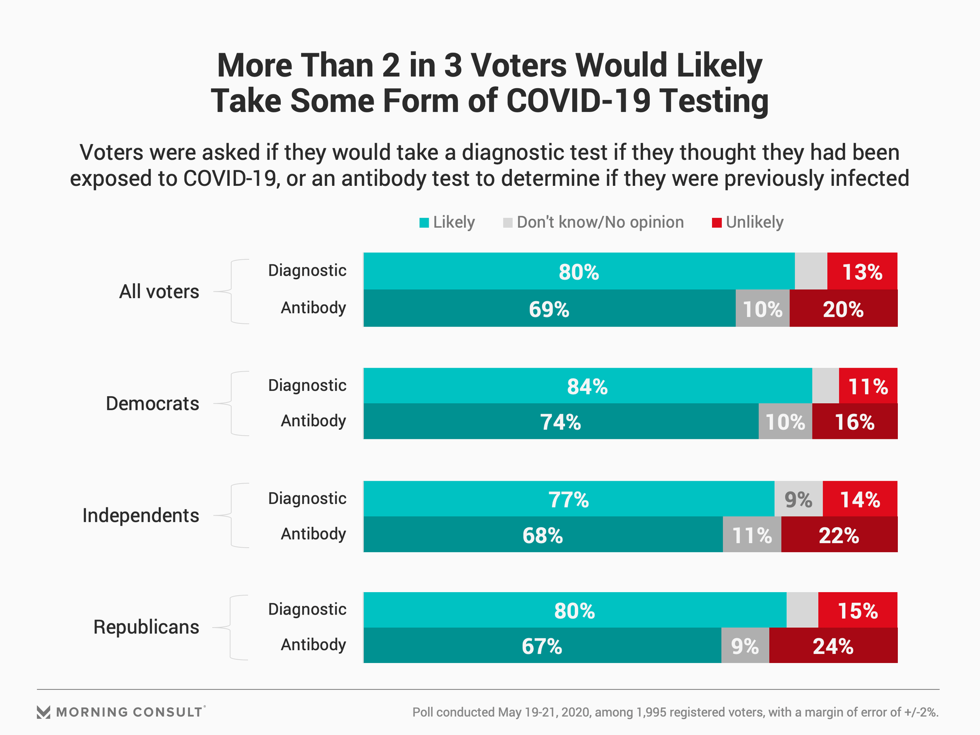 - Almost 7 in 10 voters said they would take an antibody test to determine if they previously were infected with COVID-19.