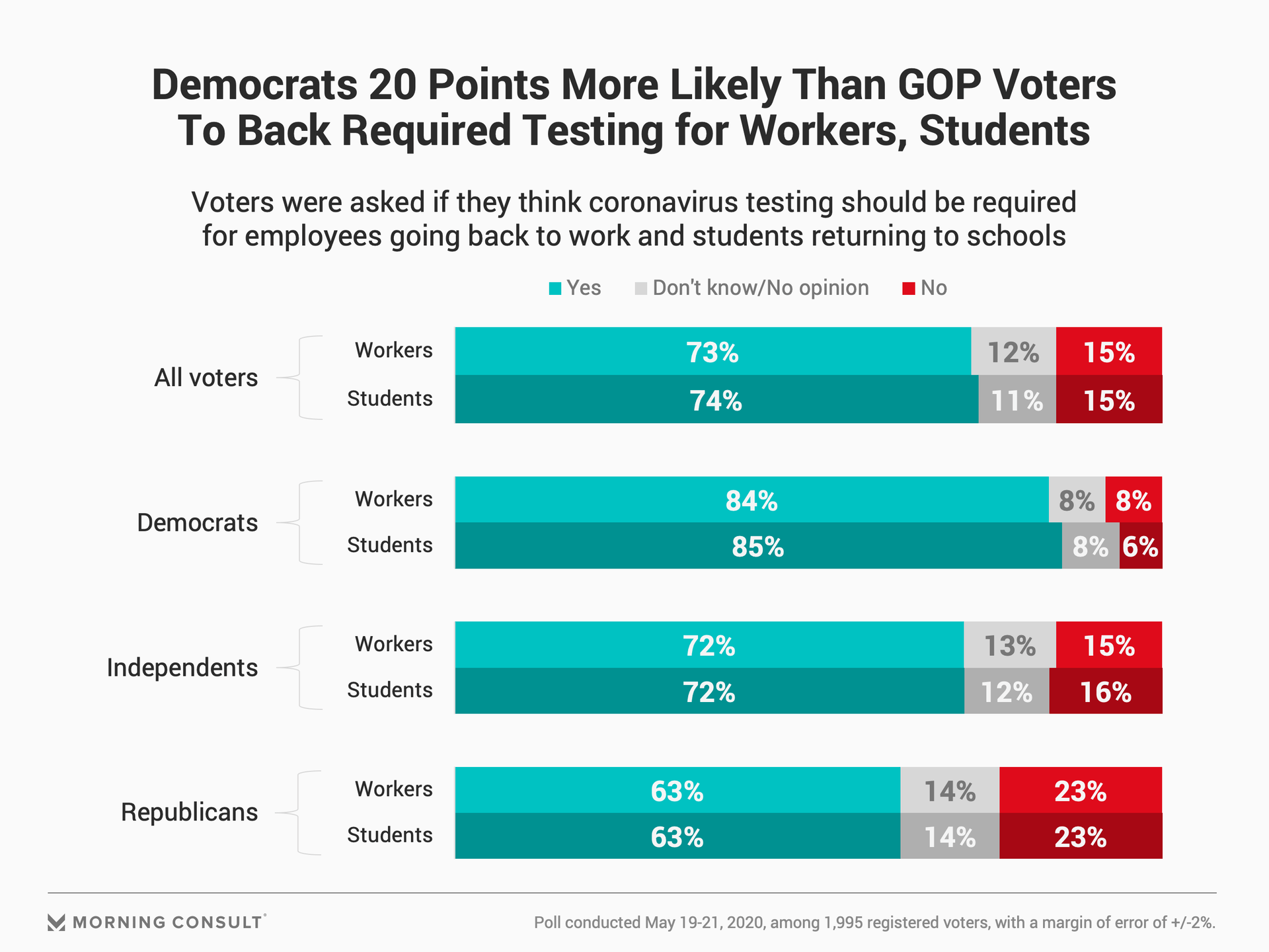 In a May 19-21 survey, nearly three-quarters of the electorate said workers should be required to be tested for coronavirus before going back to work, with a statistically equal share saying the same for students returning to school or colleges. Fifteen percent said testing shouldn’t be required for either group, and 12 percent and 11 percent, respectively, said they don’t know or have no opinion on coronavirus testing for employees and students.