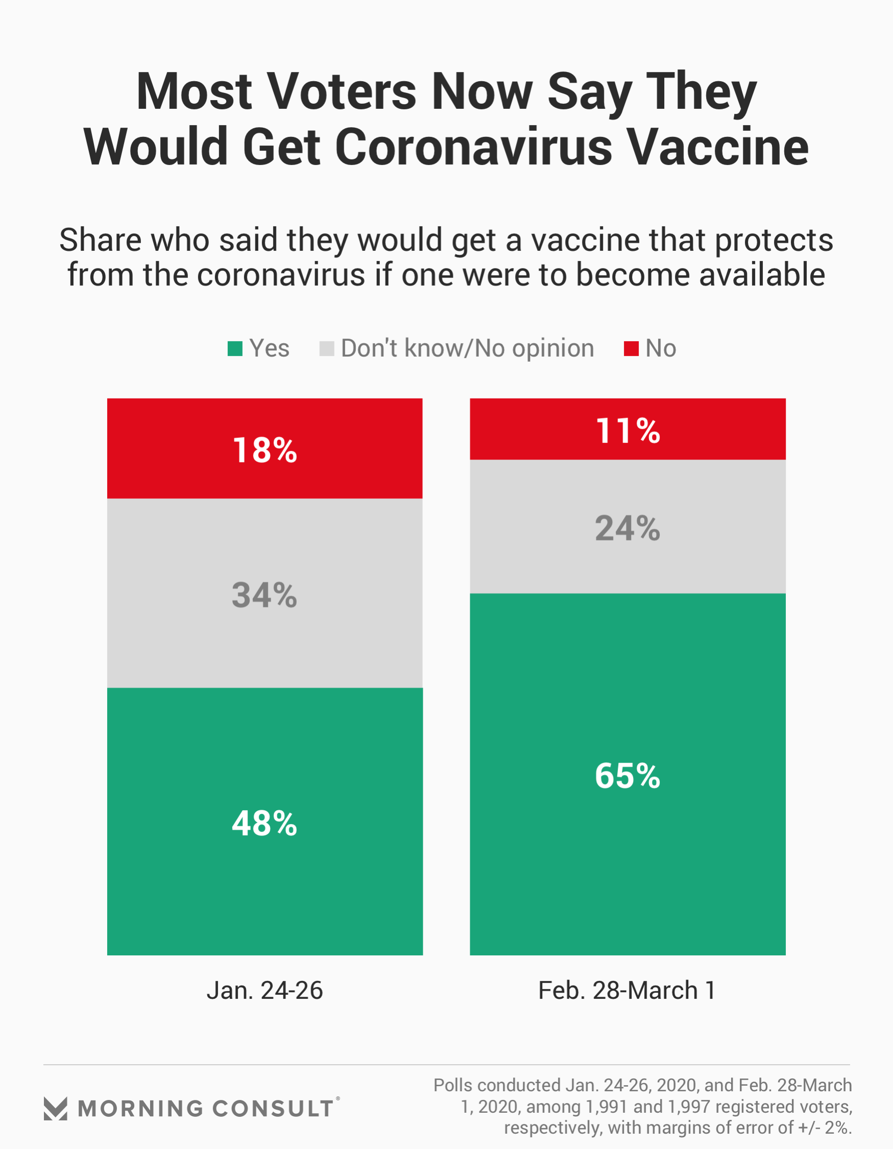 65% of voters say they would get vaccinated if a vaccine were available, up 17 points from January.