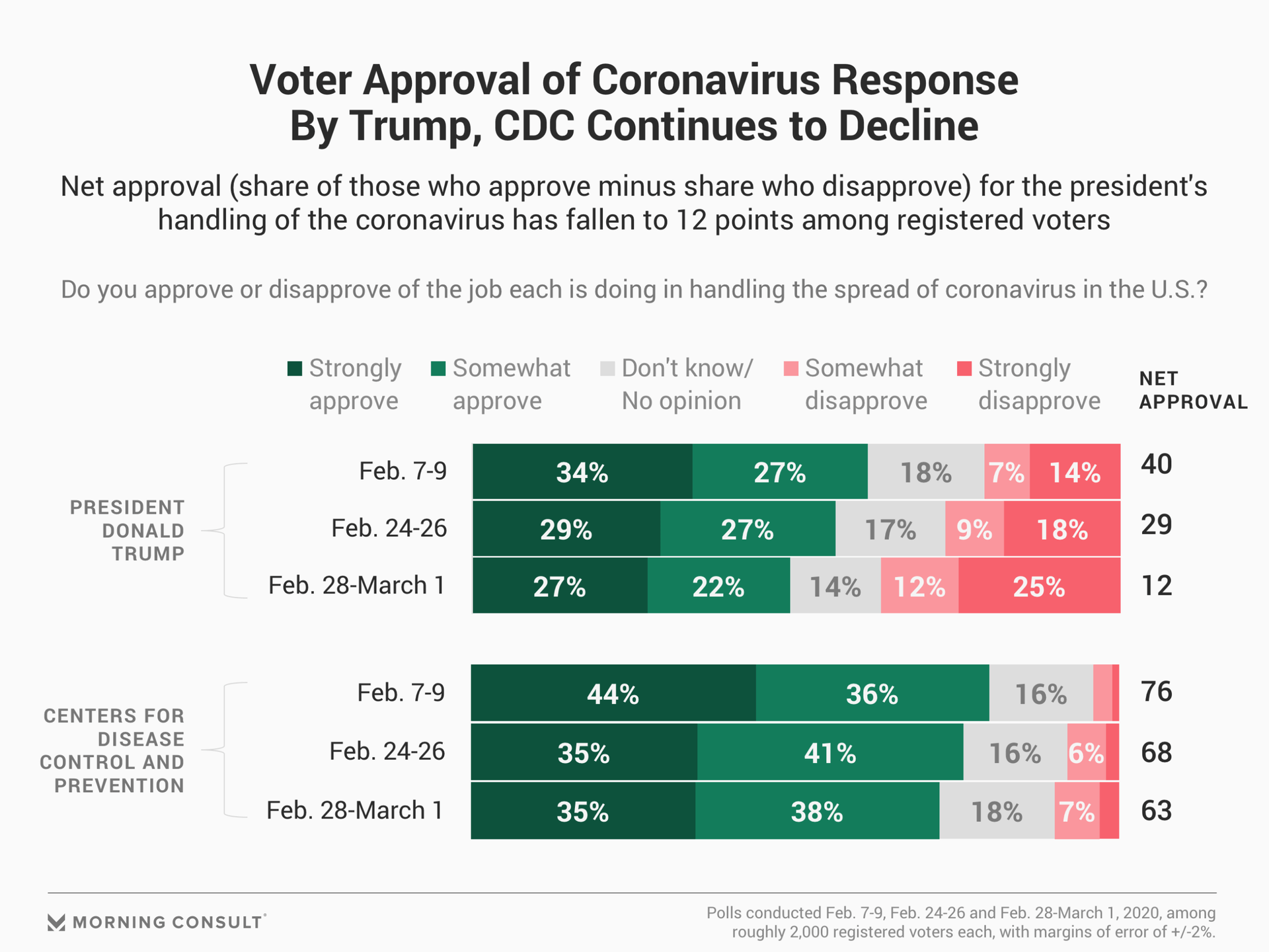 According to a Feb. 28-March 1 survey, fewer than half (49 percent) of voters approve of President Donald Trump’s response to the outbreak, down from 56 percent who said the same in a Feb. 24-26 survey — a decline fueled by a 9-point drop among independents and 7-point drop among Democrats. The share who disapprove of his response is also up to 37 percent. As a result, net approval (the share who approve minus the share who disapprove) for the president’s handling of the coronavirus is now at 12 points, sinking to less than a third of what it was three weeks ago.