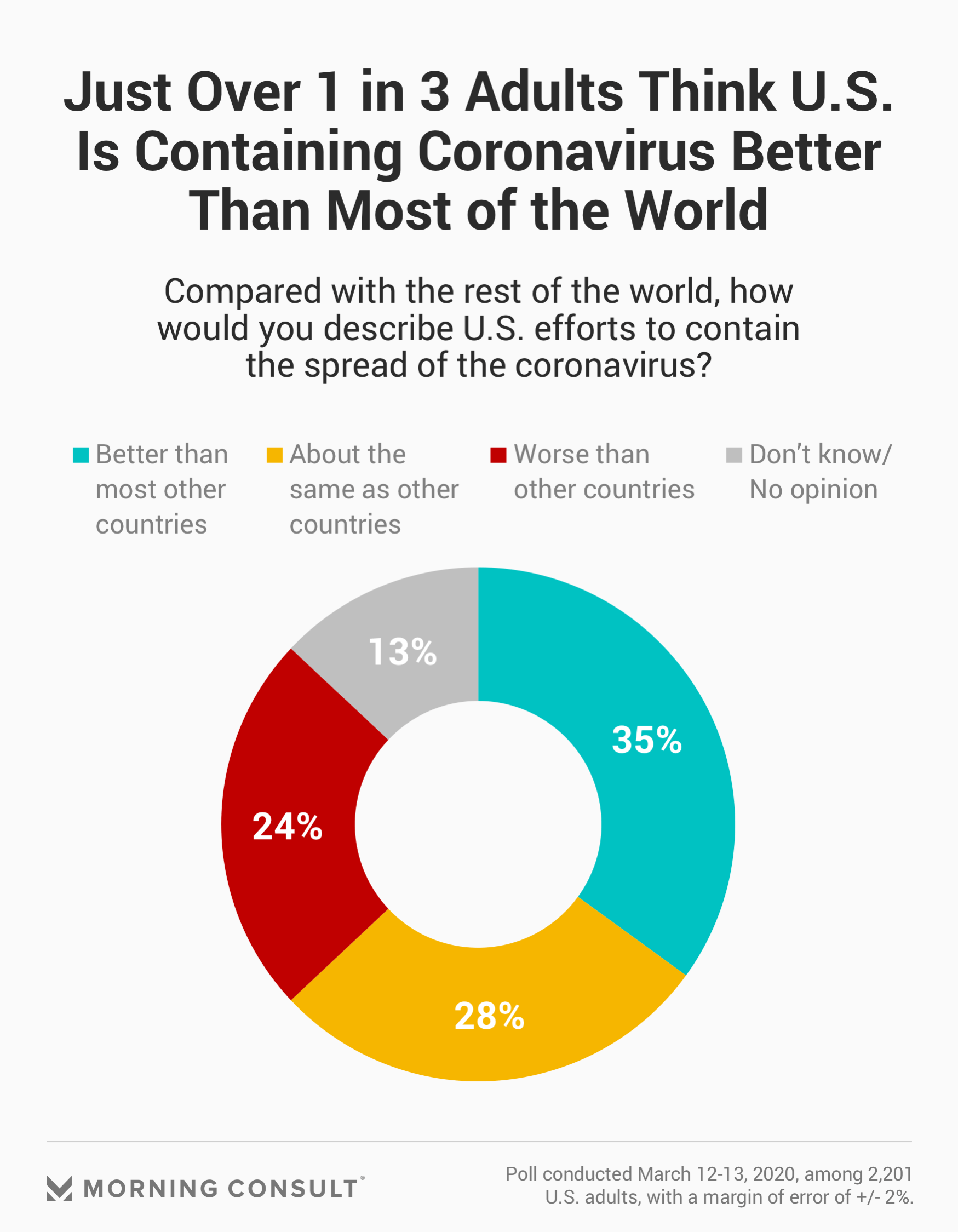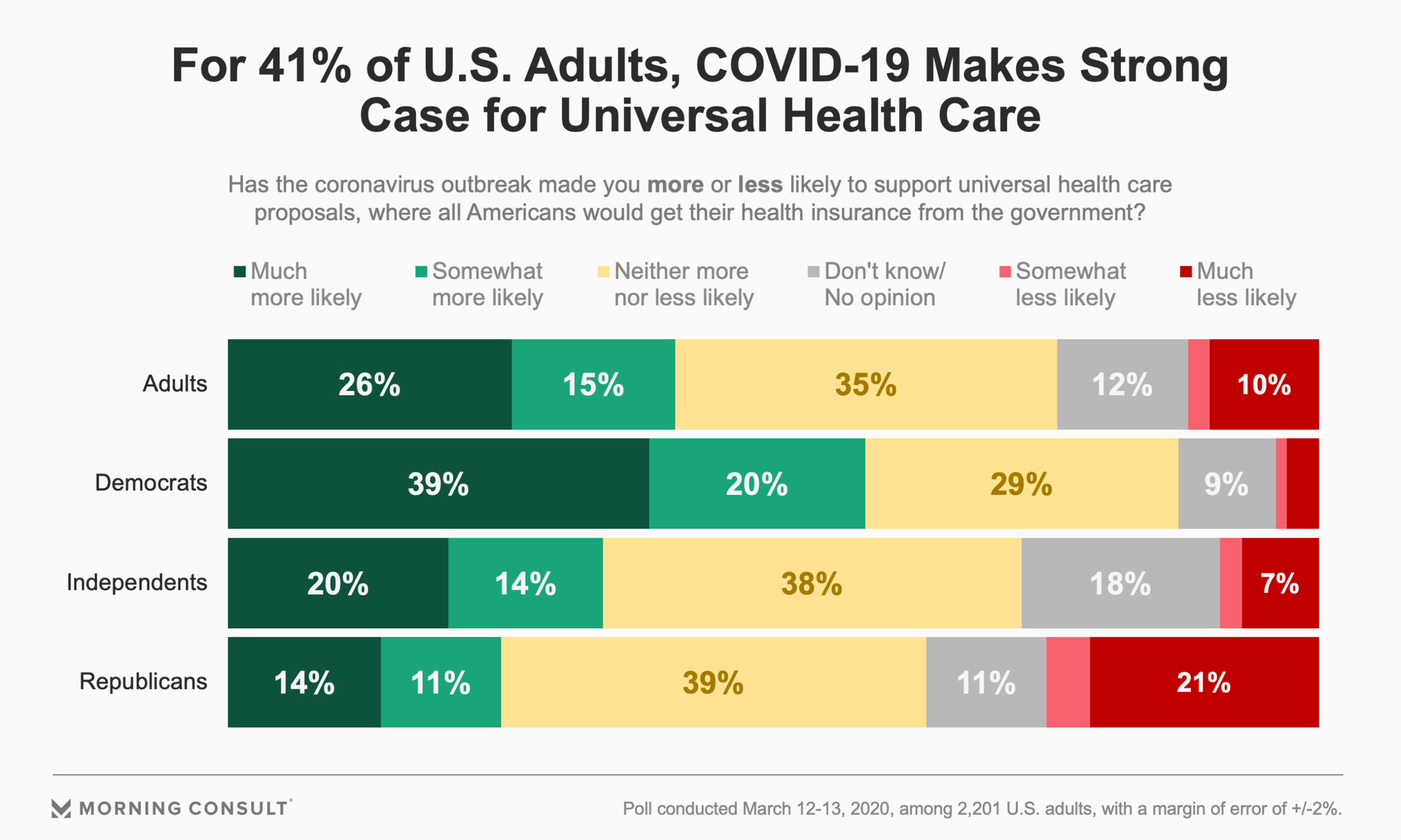 More than 2 in 5 U.S. adults say the outbreak has increased their likelihood of supporting universal health care proposals where the government would provide all Americans with health insurance, according to new Morning Consult data. That includes 1 in 4 Republicans and 34 percent of independents. The poll has a margin of error of 2 percentage points.