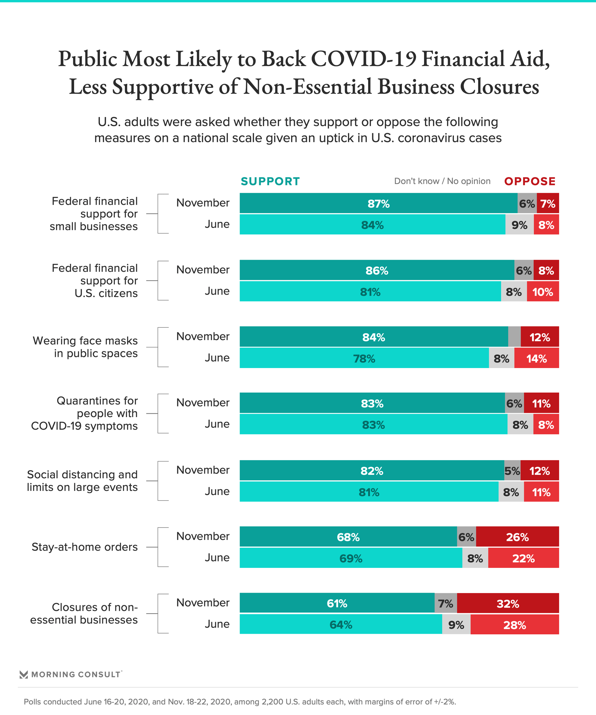 Most Americans support statewide mask mandates that carry penalties and stay-at-home orders, according to a new Morning Consult survey conducted as the country stares down its first COVID-19 winter.