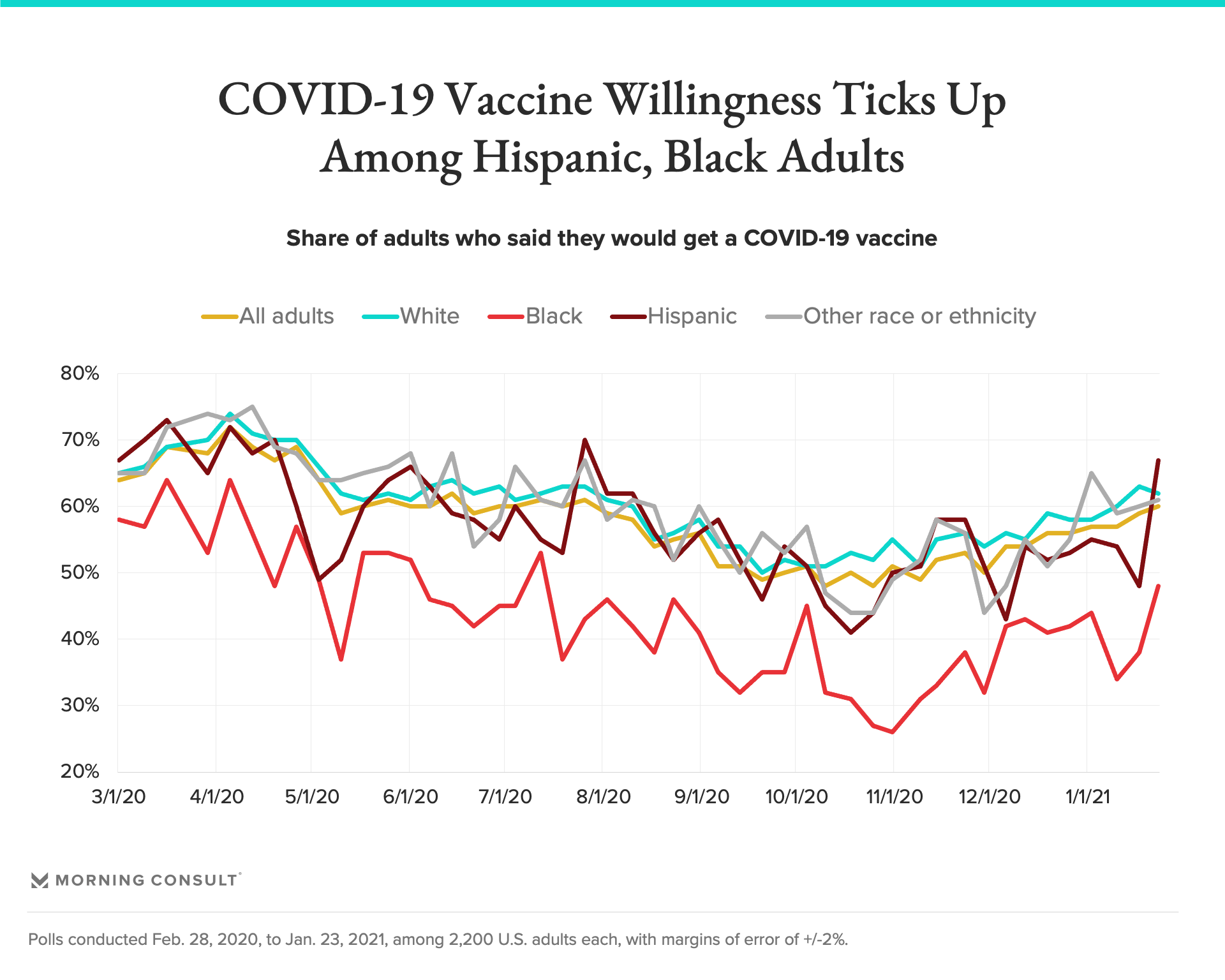 60% of adults said they would get a COVID-19 shot, the first time vaccine willingness has hit that share since late July.