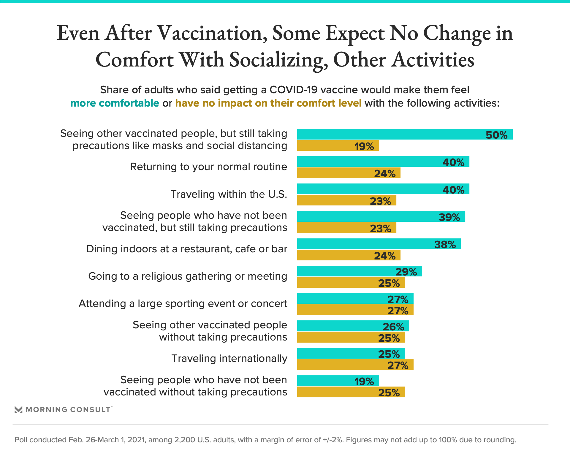 Overall, 40 percent of adults said they'd be more comfortable returning to their normal routine after they're vaccinated. About the same share said they’d be more comfortable traveling within the United States or dining indoors after getting a shot, while people were generally split on whether they’d be more comfortable attending a religious gathering, a large sporting event or a concert post-vaccination.