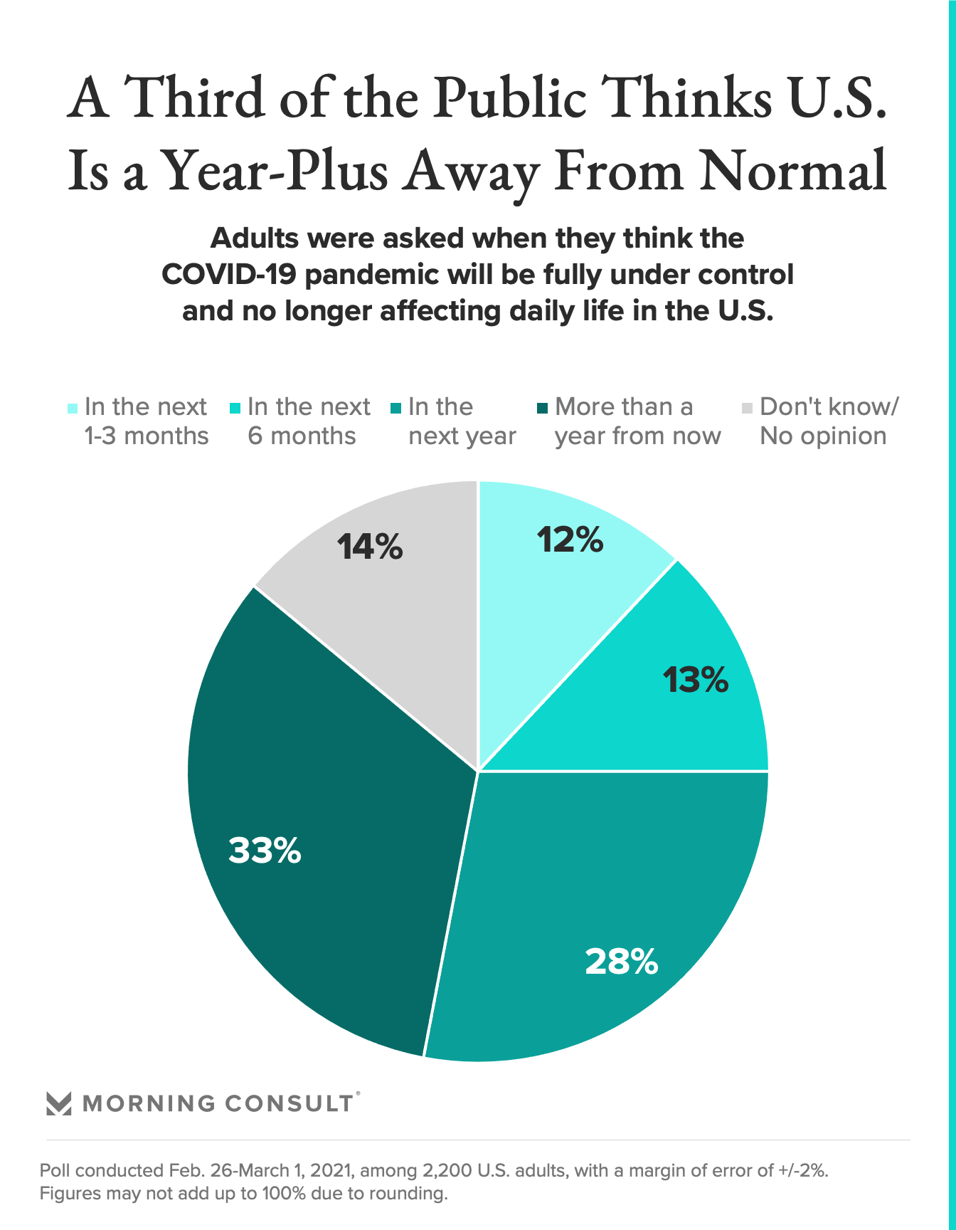 A third of adults say it will be more than a year before the pandemic is fully under control and no longer impacting daily life in the United States.