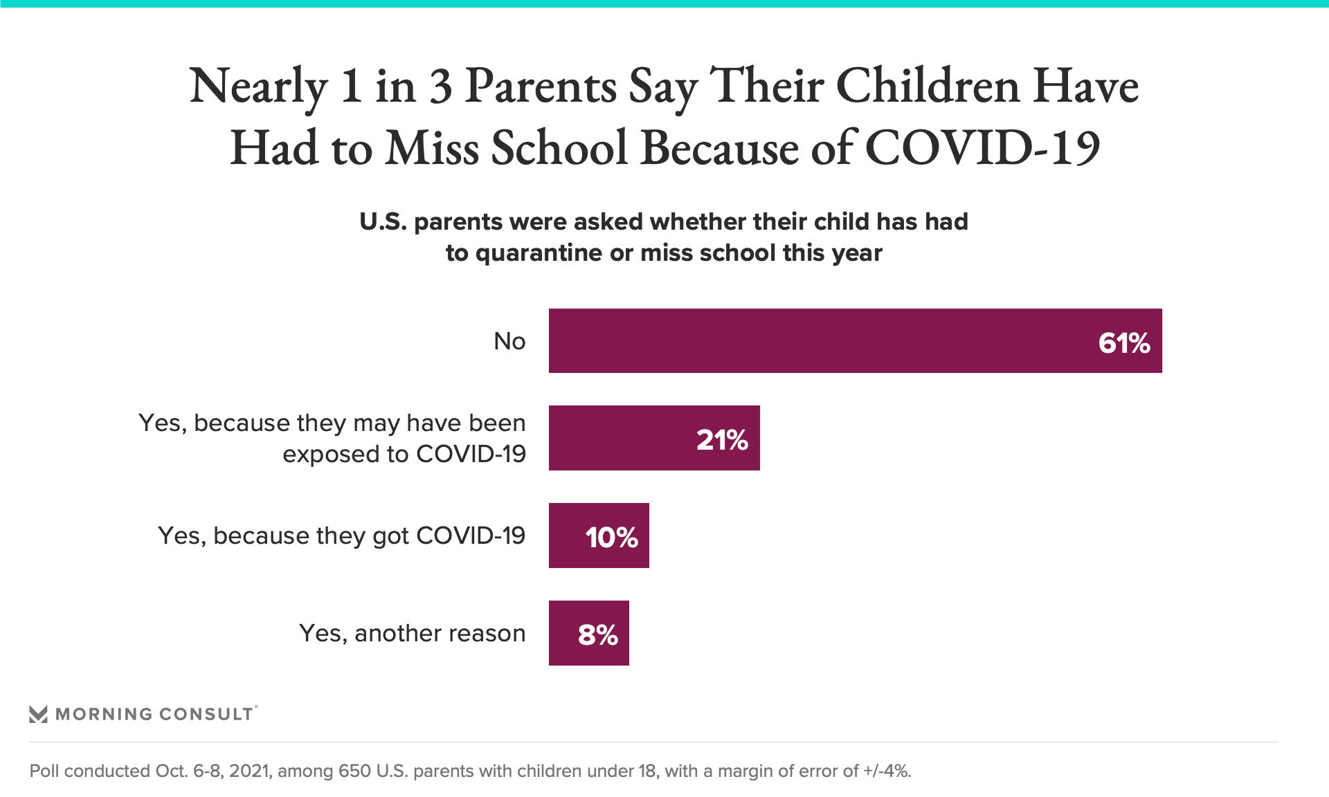 1 in 5 U.S. parents with children under 18 said their kids have had to quarantine or miss school because of a possible COVID-19 exposure while 1 in 10 said their kids have missed school or quarantined because they got COVID-19.