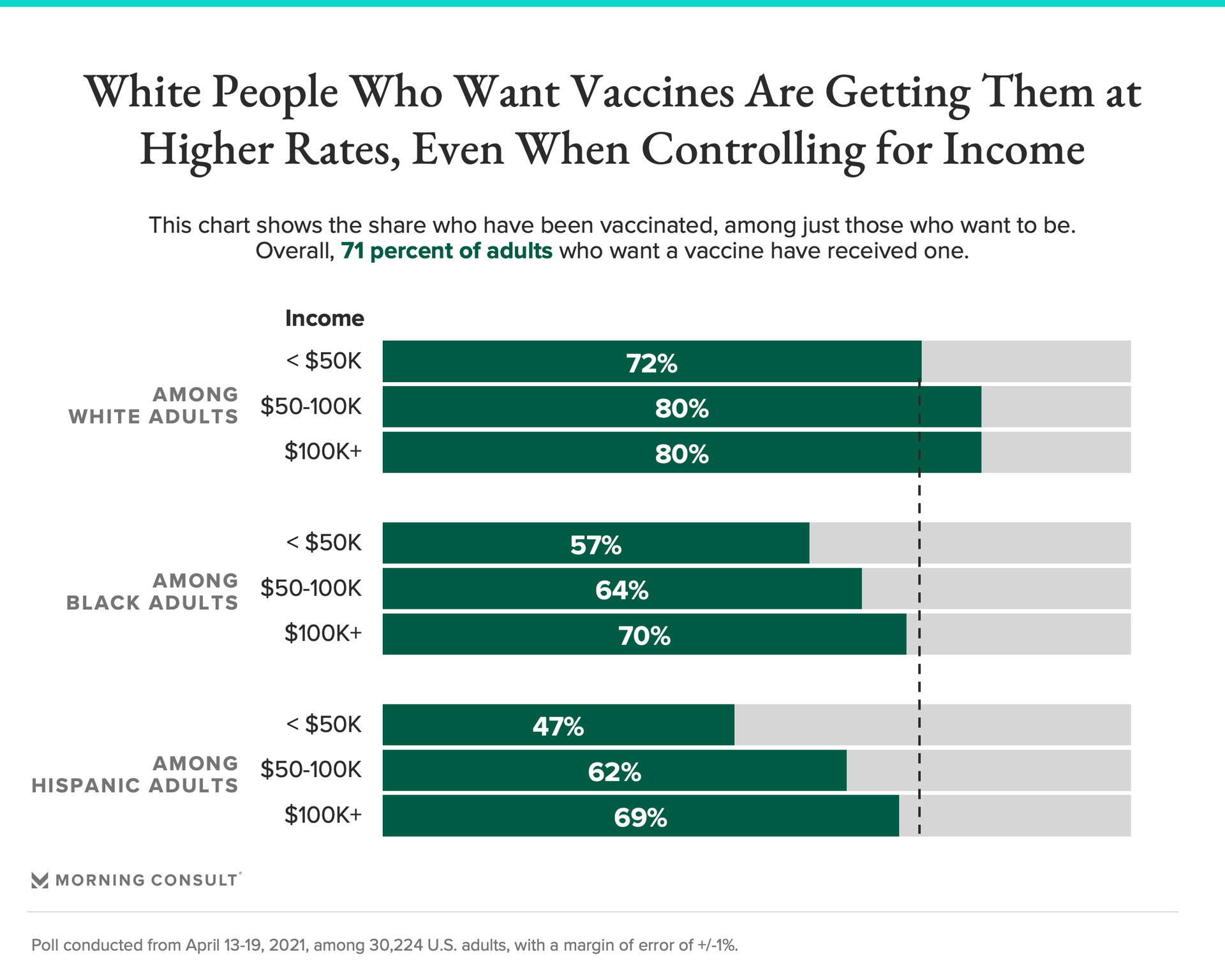 77% of white adults who want a shot have gotten one, compared with 60% of Black adults and 55% of Hispanics who want one.