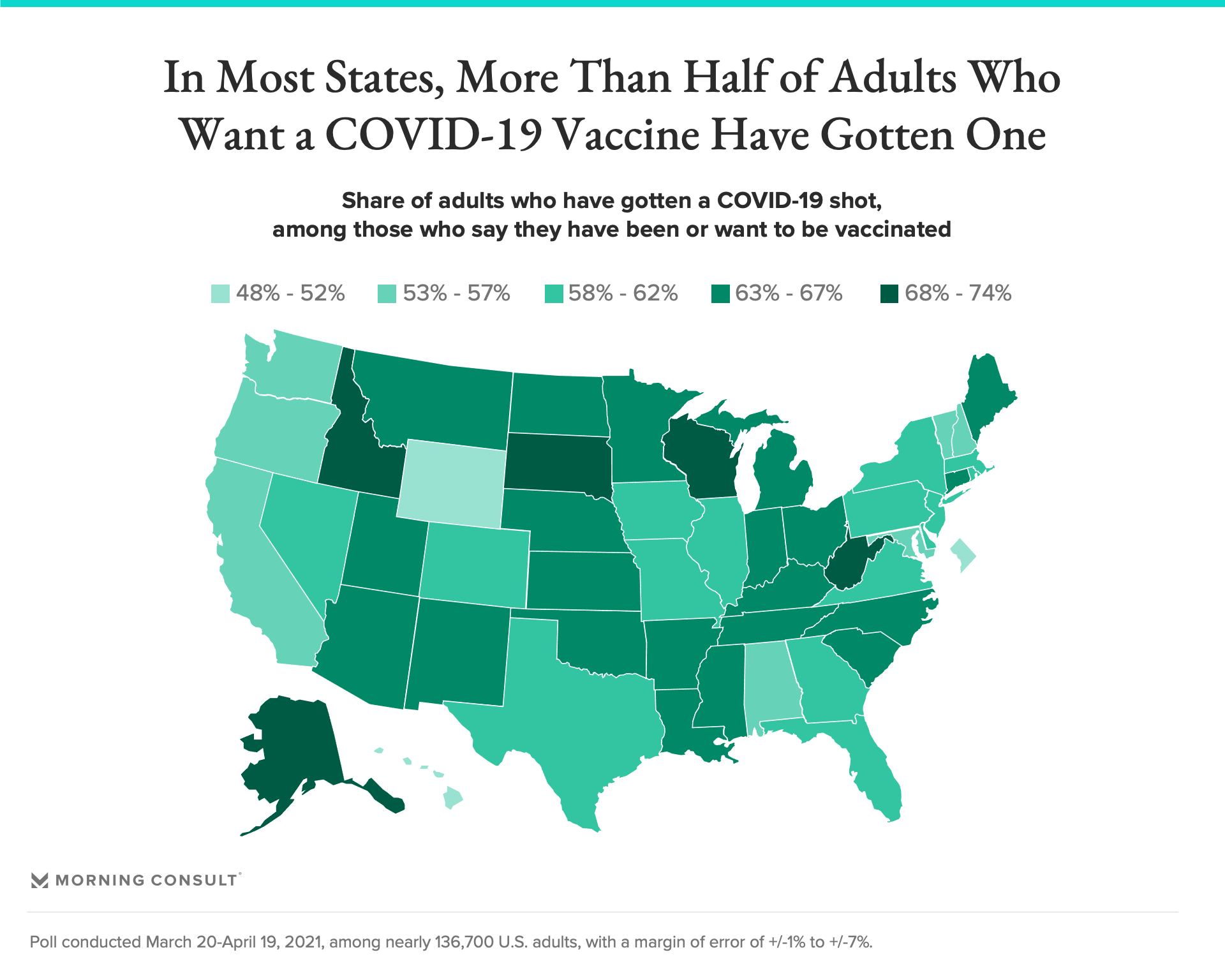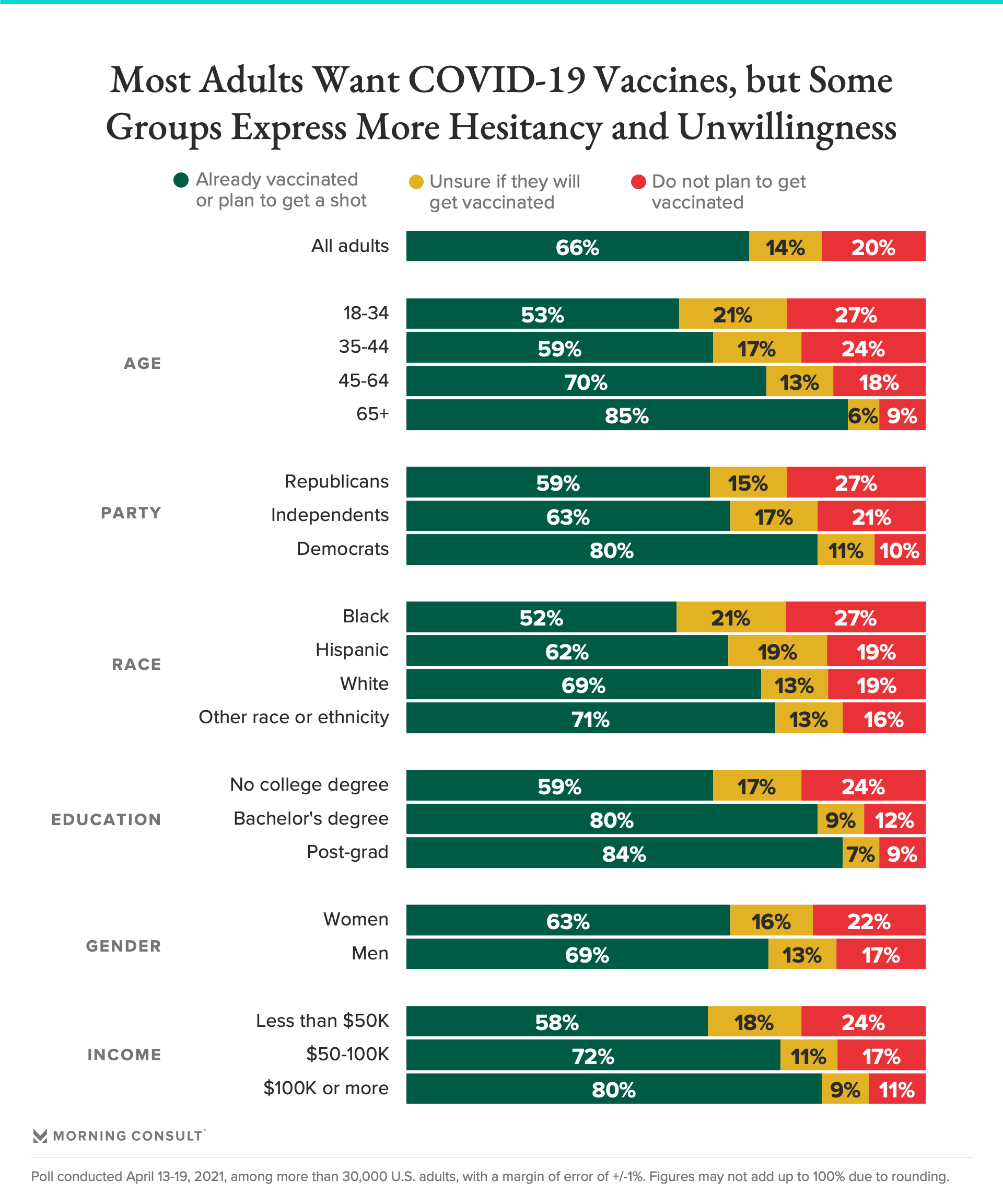 A new Morning Consult analysis, drawn from a survey of more than 30,000 adults and conducted April 13-19, indicates that while most people across demographic groups want a COVID-19 vaccine, both vaccine reluctance and access to shots are causing friction in the rollout.