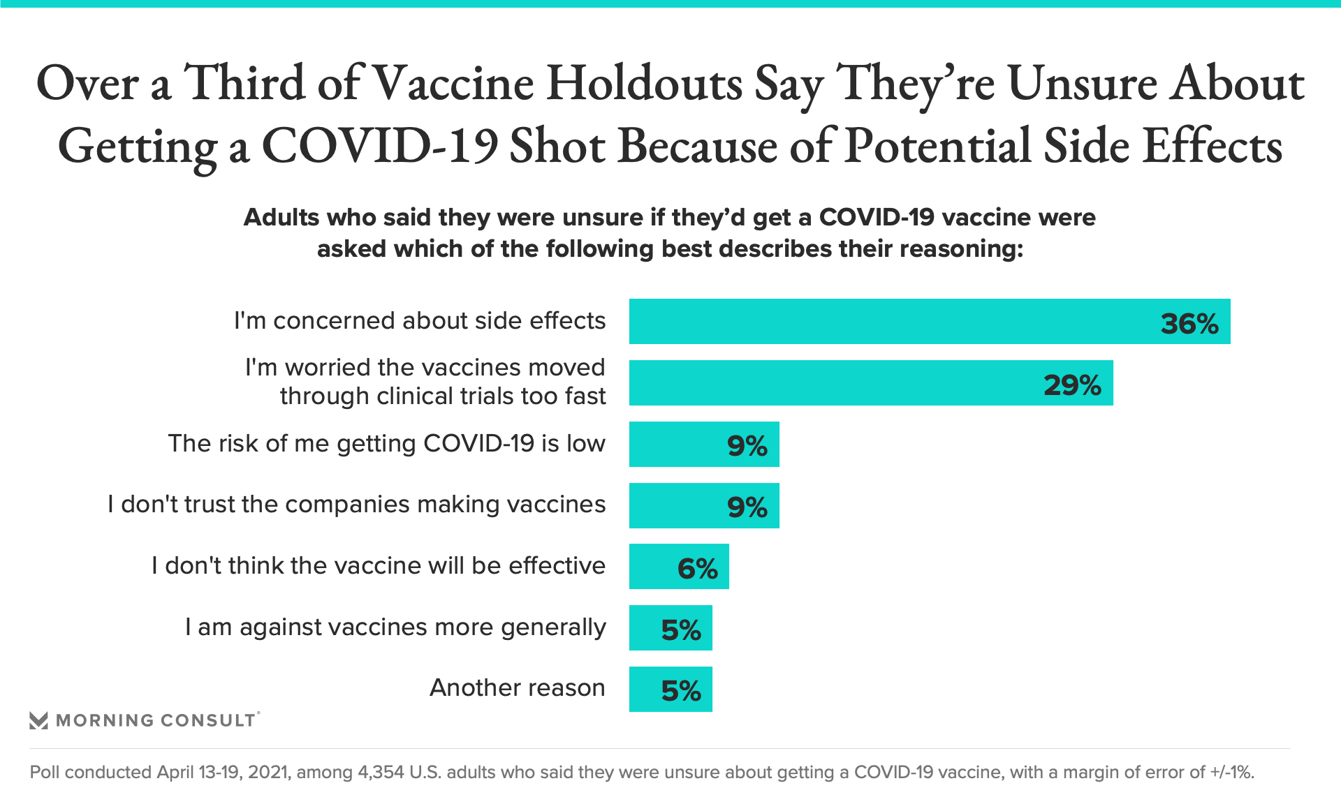Among adults who are unsure about getting vaccinated, 36% said they are concerned about potential side effects, while 29% said they are worried that the vaccines moved too quickly through clinical trials.