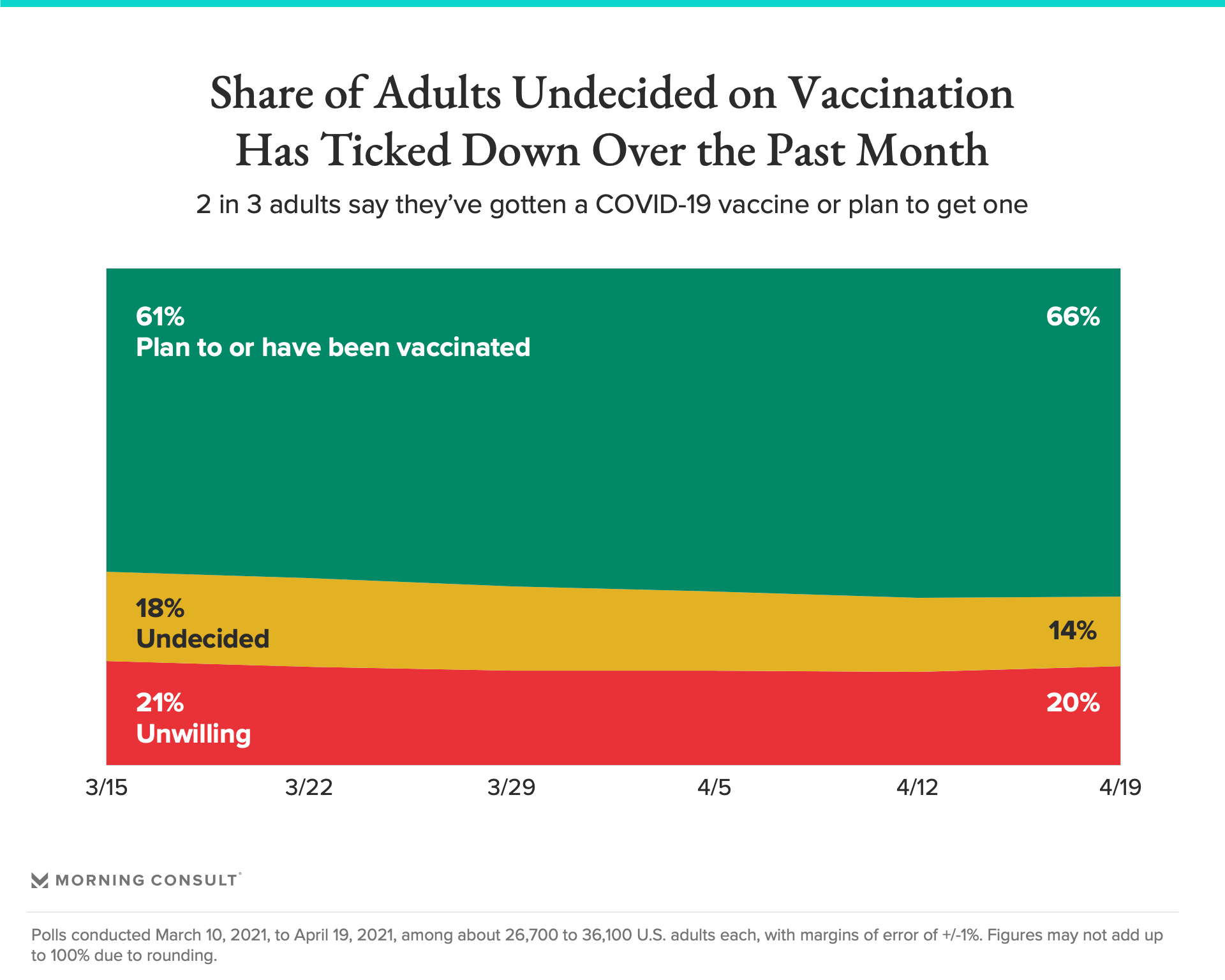 Despite the lack of trust some have in vaccine manufacturers, the pause on Johnson & Johnson’s vaccine rollout doesn’t appear to have dampened people’s enthusiasm for COVID-19 shots. Overall, 66 percent of adults say they’ve either been vaccinated or plan to get a shot -- a share that is level with the week before -- while 14 percent are unsure and 20 percent have no plans to get vaccinated.