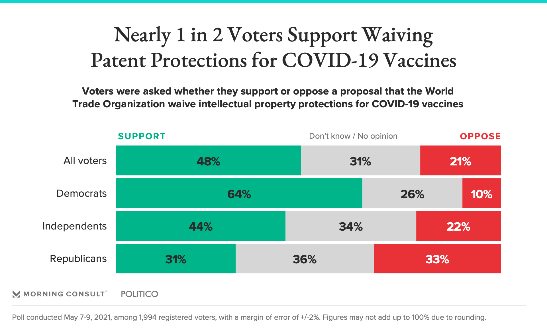 - 48% of voters said they support waiving patent protections for COVID-19 vaccines, while 21% oppose the move and 31% said they don't know or have no opinion.